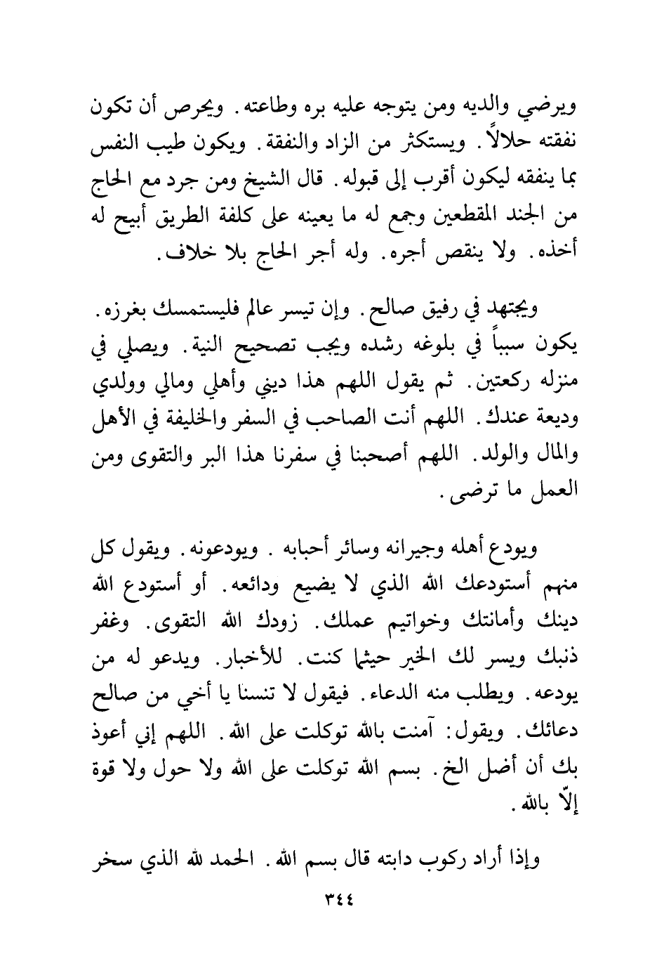 ويجتهد في رفيق صالح. وإن تيسر عالم فليستمسك بغرزه. يكون سببا في بلوغه رشده ويجب تصحيح النية. ويصلي في منزله ركعتين. ثم يقول اللهم هذا ديني وأهلي ومالي ووليد وديعة عندك. الله أنت الصاحب في السفر والخليفة في الأهل والمال والولد. اللهم أصبحنا في سفرنا هذا البر والتقوى ومن العمل ما ترضى.