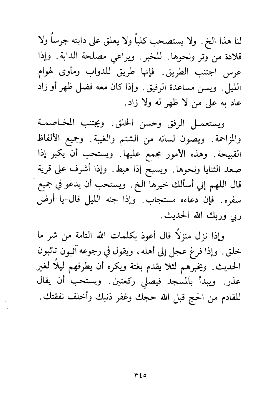 ويستعمل الرفق وحسن الخلق. ويجتنب المخاصمة والمزاحمة. ويصون لسانه من الشتم والغيبة. وجميع الألفاظ القبيحة. وهذه الأمور مجمع عليها. ويستحب أن يكبر إذا صعد الثنايا ونحوها. ويسبح إذا هبط. وإذا أشرف على قرية قال اللهم إني أسألك خيرها إلخ. ويستحب أن يدعو في جميع سفره. فإن دعاءه مستجاب. وإذا جنه الليل قال يا أرض ربي وربك الله الحديث.