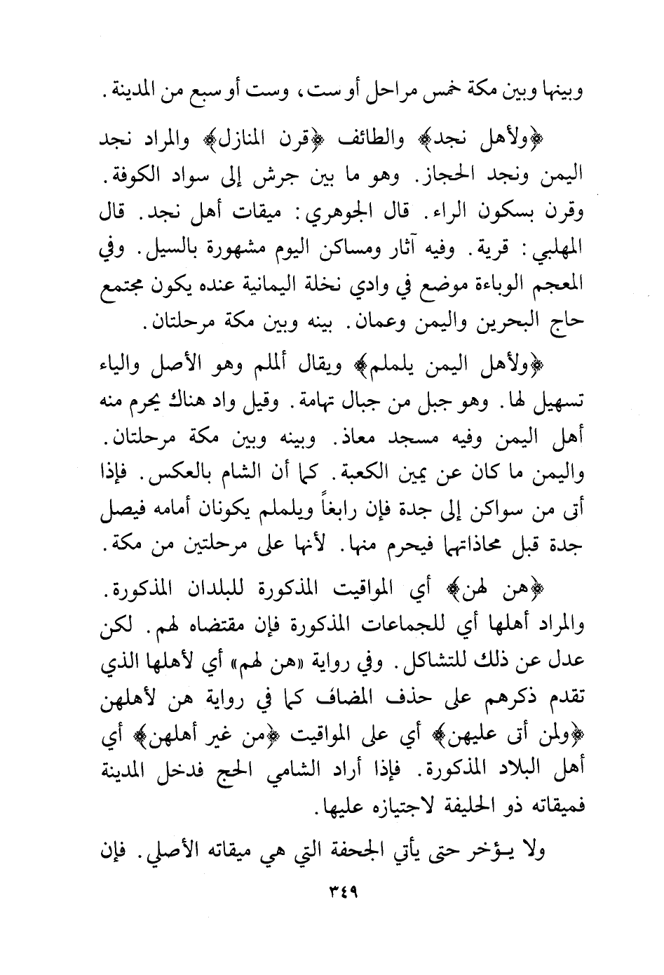 (ولأهل نجد) والطائف 0قرن المنازل) والمراد نجد اليمن ونجد الحجاز وهو ما بين جرش إلى سواد الكوفة وقرن بسكون الراء. قال الجوهري: ميقات أهل نجد. قال المهلبي: قرية. وفيه آثار ومساكن اليوم مشهورة بالسيل. وفي المعجم الوباءة موضع في وادي نخلة اليمانية عنده يكون مجتمع حاج البحرين واليمن وعمان. بينه وبين مكة مرحلتان.