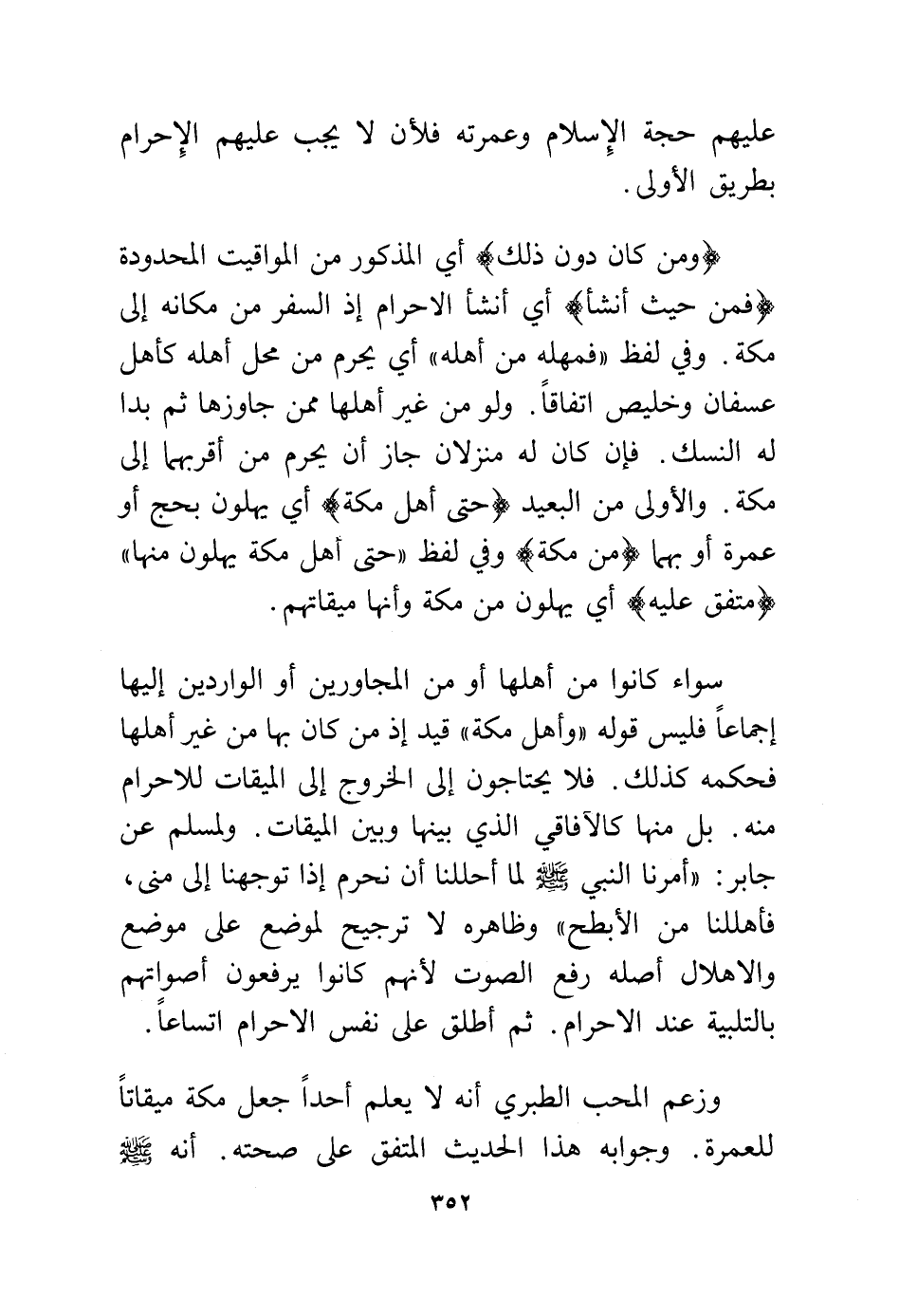 سواء كانوا من أهلها أو من المجاورين أو الواردين إليها إجماعا فليس قوله "وأهل مكة" قيد إذ من كان بها من غير أهلها فحكمه كذلك. فلا يحتاجون إلى الخروج إلى الميقات للإحرام منه. بل منها كالآفاقي الذي بينها وبين الميقات. ولمسلم عن جابر: "أمرنا النبي - صلى الله عليه وسلم - لما أحللنا أن نحرم إذا توجهنا إلى منى، فأهللنا من الأبطح" وظاهره لا ترجيح لموضع على موضع والأهلال أصله رفع الصوت لأنهم كانوا يرفعون أصواتهم بالتلبية عند الإحرام. ثم أطلق على نفس الإحرام اتساعًا.