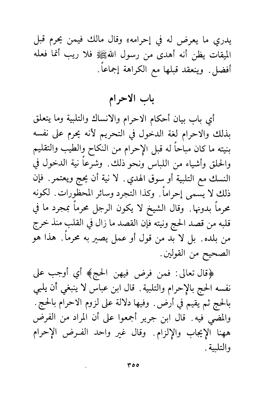 أي باب بيان أحكام الإحرام والأنساك والتلبية وما يتعلق بذلك والإحرام لغة الدخول في التحريم لأنه يحرم على نفسه بنيته ما كان مباحًا له قبل الإحرام من النكاح والطيب والتقليم والحلق وأشياء من اللباس ونحو ذلك. وشرعا نية الدخول في النسك مع التلبية أو سوق الهدي لا نية أن يحج ويعتمر فإن ذلك لا يسمى إحراما. وكذا التجرد وسائر المحظورات. لكونه محرما بدونها. وقال الشيخ لا يكون الرجل محرما بمجرد ما في قلبه من قصد الحج ونيته فإن القصد ما زال في القلب منذ خرج من بلده. بل لا بد من قول أو عمل يصير به محرما. هذا هو الصحيح من القولين.