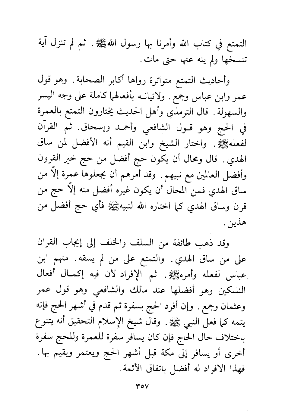 وقد ذهب طائفة من السلف والخلف إلى إيجاب القران على من ساق الهدي. والتمتع علىمن لم يسقه. منهم ابن عباس لفعله وأمره - صلى الله عليه وسلم -. ثم الإفراد لأن فيه إكمال افعال ابن سكين وهو أفضلها عند مالك والشافعي وهو قول عمر وعثمان وجمع. وإن أفرد الحج بسفرة ثم قدم في أشهر الحج فإنه يتمه كما فعل النبي - صلى الله عليه وسلم -. وقال شيخ الإسلام التحقيق أنه يتنوع باختلاف حال الحاج فإن كان يسافر سفرة للعمرة وللحج سفرة أخرى أو يسافر إلى مكة قبل أشهر الحج ويعتمر ويقيم بها، فهذا. الافراد له أفضل باتفاق الأئمة.