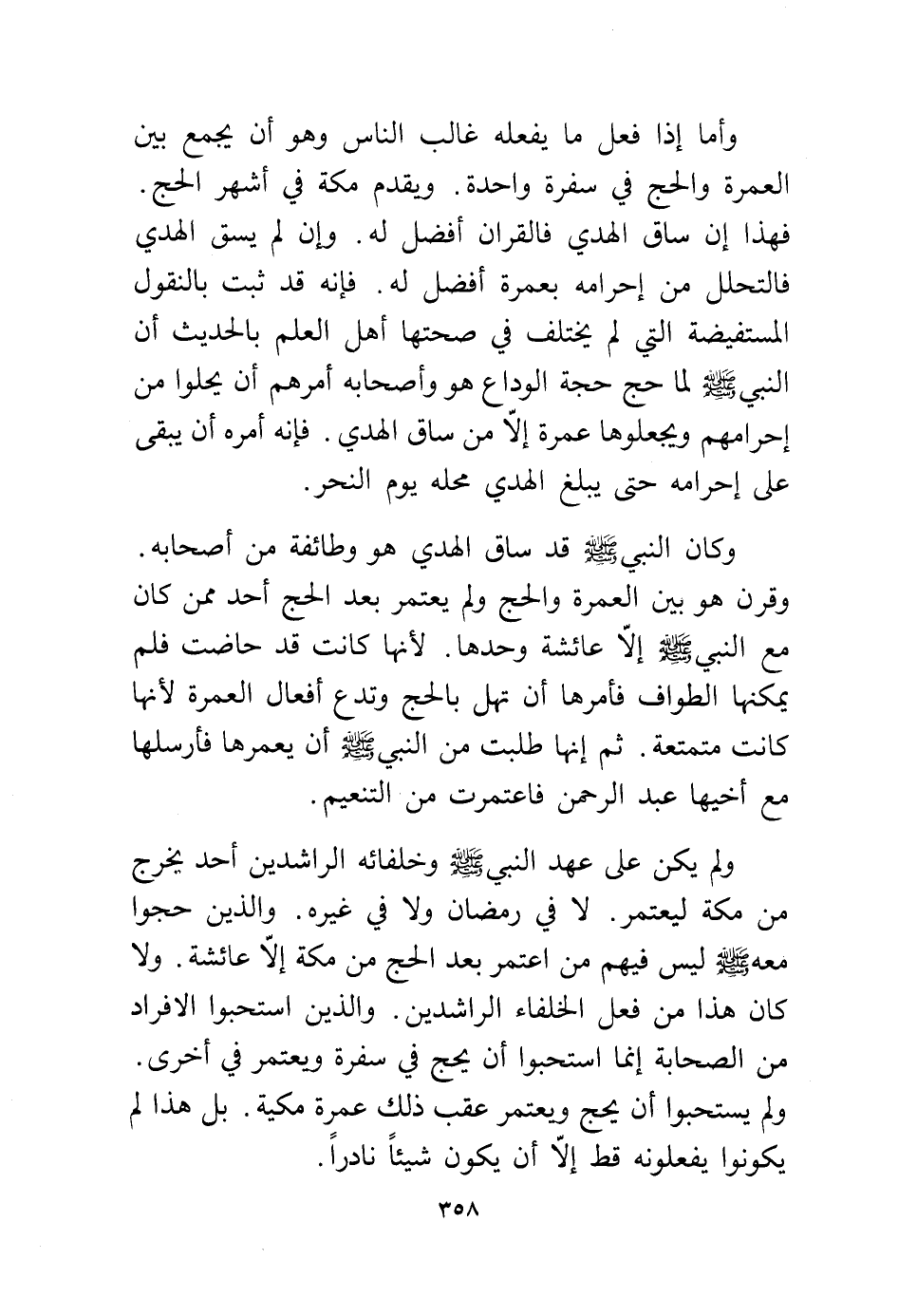 وأما إذا فعل ما يفعله غالب الناس وهو أن يجمع بين العمرة والحج في سفرة واحدة. ويقدم مكة في أشهر الحج. فهذا إن ساق الهدي فالقرآن أفضل له. وإن لم يسق الهدي فالتحلل من إحرامه بعمرة أفضل له. فإنه قد ثبت بالنقول المستفيضة التي لم يختلف في صحتها أهل العلم بالحديث أن النبي - صلى الله عليه وسلم - لما حج حجة الوداع هو وأصحابه أمرهم أن يحلوا من إحرامهم ويجعلوها عمرة إلا من ساق الهدي. فإنه أمره أن يبقى على إحرامه حتى يبلغ الهدي محله يوم النحر.