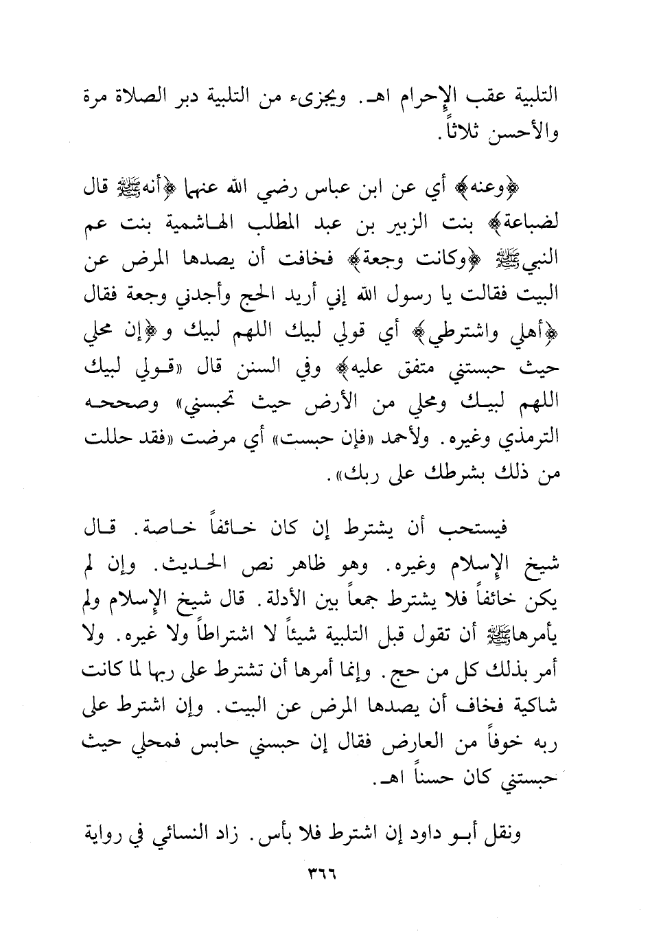 (وعنه) أي عن ابن عباس رضي الله عنهما (أنه - صلى الله عليه وسلم - قال لضباعة) بنت الزبير بن عبد المطلب الهاشمية بنت عم النبي - صلى الله عليه وسلم - (وكانت وجعة) فخافت ان يصدها المرض عن البيت فقالت يا رسول الله إني اريد الحج وأجدني وجعة فقال (أهلي واشترطي) أي قول يلبيك اللهم لبيك و (إن محلي حيث حبستني متفق عليه) وفي السنن قال "قولي لبيك اللهم لبيك ومحلي من الأرض حيث تحبسني" وصححه الترمذي وغيره. ولأحمد "فإن حبست" أي مرضت "فقد حللت من ذلك بشرطك على ربك".