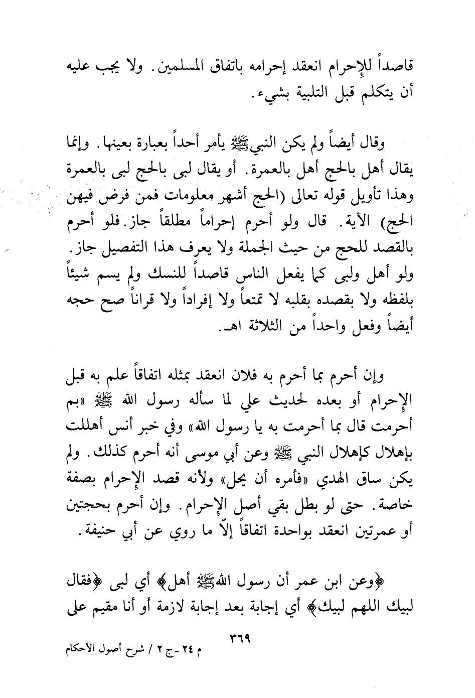 وقال ايضا ولم يكن النبي - صلى الله عليه وسلم - يأمر أحدا بعبارة بعينها. وإنما يقال أهل بالحج أهل بالعمرة. أو يقال لبى بالحج لبى بالعمرة وهذا تأويل قوله تعالى: {الْحَجُّ أَشْهُرٌ مَعْلُومَاتٌ فَمَنْ فَرَضَ فِيهِنَّ الْحَجَّ} الآية. قال ولو أحرم إحراما مطلقا جاز. فلو أحرم بالقصد للحج من حيث الجملة ولا يعرف هذا التفصيل جاز. ولو أهل ولبى كما يفعل الناس قاصدا للنسك ولم يسم شيئا بلفظه ولا بقصده بقلبه لا تمنعا ولا إفرادا ولا قرانا صح حجه ايضا وفعل واحدا من الثلاثة اهـ.