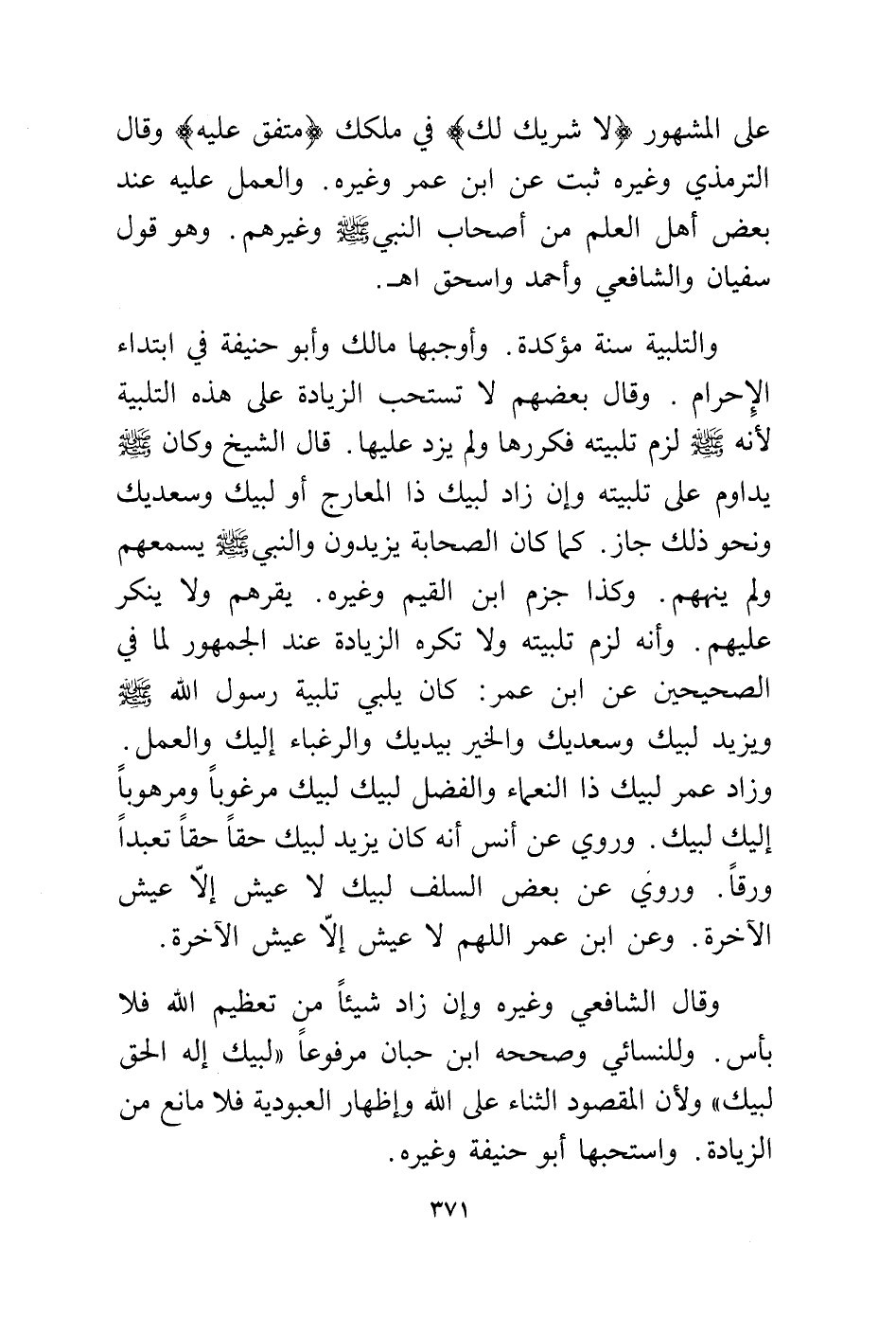 والتلبية سنة مؤكدة. وأوجبها مالك وأبو حنيفة في ابتداء الإحرام. وقال بعضهم لا تستحب الزيادة على هذه التلبية لأنه - صلى الله عليه وسلم - لزم تلبيته فكررها ولم يزد عليها. قال الشيخ وكان - صلى الله عليه وسلم - يداوم على تلبيته وإن زاد لبيك ذا المعارج أو لبيك وسعديك ونحو ذلك جاز. كما كان الصحابة يزيدون والنبي - صلى الله عليه وسلم - يسمعهم ولم ينههم. وكذا جزم ابن القيم وغيره. يقرهم ولا ينكر عليهم. وأنه لزم تلبيته ولا تكره الزيادة عند الجمهور لما في الصحيحين عن ابن عمر: كان يلبي تلبية رسول الله - صلى الله عليه وسلم - ويزيد لبيك وسعديك والخير بيديك والرغباء إليك والعمل وزاد عمر لبيك ذا النعماء والفضل لبيك لبيك مرغوبا ومرهوبا إليك لبيك. وروي عن أنس أنه كان يزيد لبيك حقا حقا تعبدا ورقا. وروي عن بعض السلف لبيك لا عيش إلا عيش الآخرة. وعن ابن عمر اللهم لا عيش إلا عيش الآخرة.