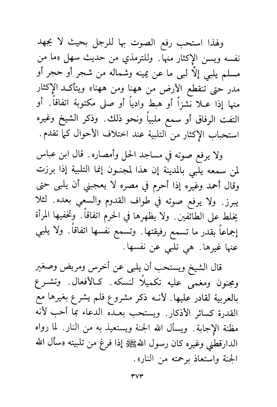 ولا يرفع صوته في مساجد الحل وأمصاره. قال ابن عباس لمن سمعه يلبي بالمدينة إن هذا لمجنون إنما التلبية إذا برزت وقال أحمد وغيره إذا أحرم في مصره لا يعجبني أن يلبي حتى يبرز. ولا يرفع صوته في طواف القدوم والسعي بعده. لئلا يخلط على الطائفين. ولا يظهرها في الحرم اتفاقا. وتخفيها المرأة إجماعا بقدر ما تسمع رفيقتها. وتسمع نفسها اتفاقا. ولا يلبي عنه غيرها. هي تلبي عن نفسها.