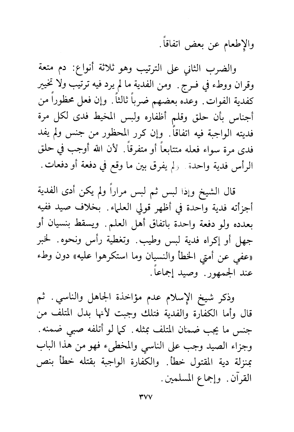 وذكر شيخ الإسلام عدم مؤاخذة الجاهل والناسي. ثم قال وأما الكفارة والفدية فتلك وجبت لأنها بدل المتلف من جنس ما يجب ضمان المتلف بمثله. كما لو أتلفه صبي ضمنه. وجزاء الصيد وجب على الناسي والمخطئ فهو من هذا الباب بمنزلة دية المقتول خطأ. والكفارة الواجبة بقتله خطأ بنص القرآن. وإجماع المسلمين.