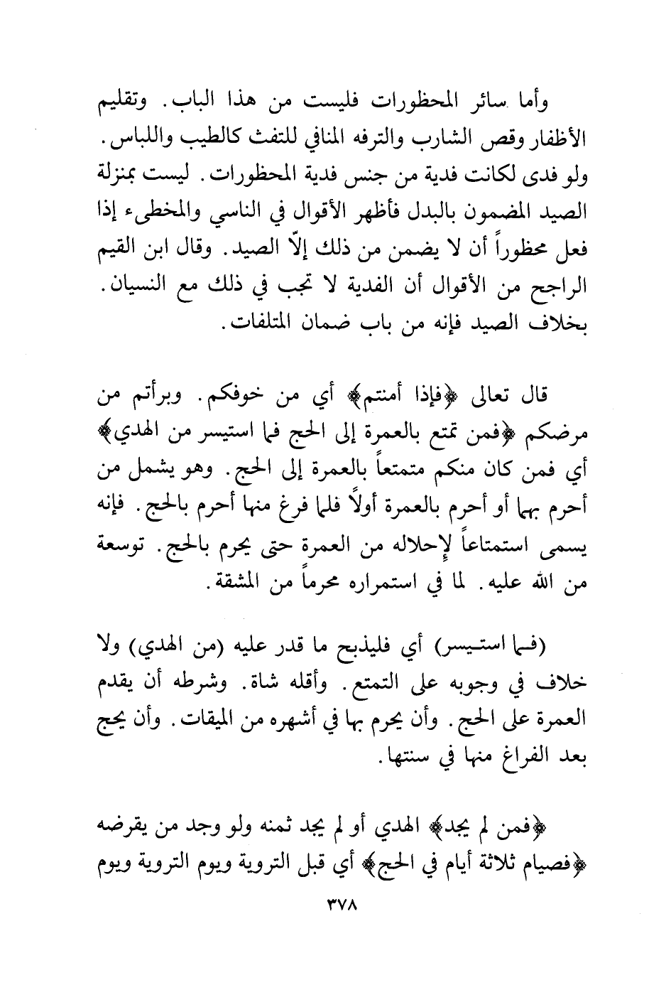 قال تعالى: {فَإِذَا أَمِنْتُمْ} أي من خوفكم. وبرأتم من مرضكم {فَمَنْ تَمَتَّعَ بِالْعُمْرَةِ إِلَى الْحَجِّ فَمَا اسْتَيْسَرَ مِنْ الْهَدْيِ} أي فمن كان منكم متمتعا بالعمرة إلى الحج. وهو يشمل من أحرم بهما أو أحرم بالعمرة أولا فلما فرغ منها أحرم بالحج. فإنه يسمى استمتاعا لإحلاله من العمرة حتى يحرم بالحج. توسعة من الله عليه. لما في استمراره محرما من المشقة.