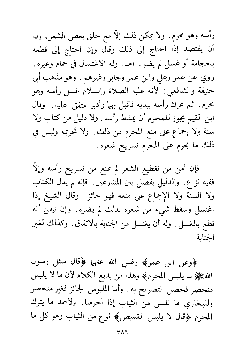 روي عن عمر وعلي وابن عمر وجابر وغيرهم. وهو مذهب أبي حنيفة والشافعي: لأنه عليه الصلاة والسلام غسل رأسه وهو محرم. ثم عرك رأسه بيديه فأقبل بهما وأدبر. متفق عليه. وقال ابن القيم يجوز للمحرم أن يمشط رأسه. ولا دليل من كتاب ولا سنة ولا إجماع على منع المحرم من ذلك. ولا تحريمه وليس في ذلك ما يحرم على المحرم تسريح شعره.