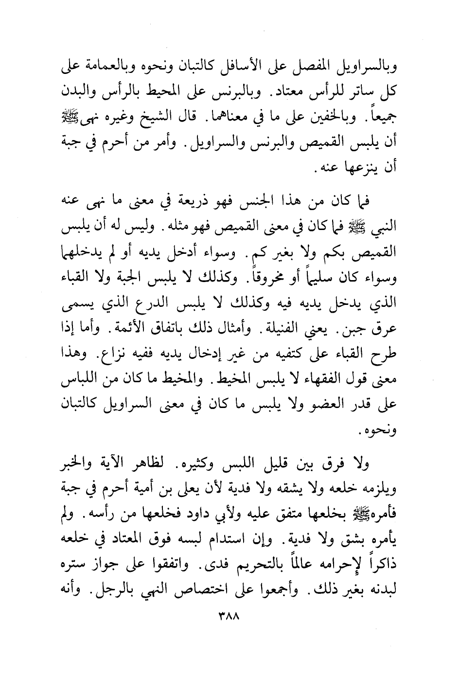 فما كان من هذا الجنس فهو ذريعة في معنى ما نهى عنه النبي - صلى الله عليه وسلم - فما كان في معنى القميص بكم ولا بغيركم. وسواء أدخل يديه أو لم يدخلهما وسواء كان سليما أو مخروقا. وكذلك لا يلبس الجبة ولا القباء الذي يدخل يديه فيه وكذلك لا يلبس الدرع الذي يسمى عرق جبن. يعني الفنيلة. وأمثال ذلك باتفاق الأئمة. وأما إذا طرح القباء على كتفيه من غير إدخال يديه ففيه نزاع. وهذا معنى قول الفقهاء لا يلبس المخيط. والمخيط ما كان من اللباس على قدر العضو ولا يلبس ما كان في معنى السراويل كالتبان ونحوه.