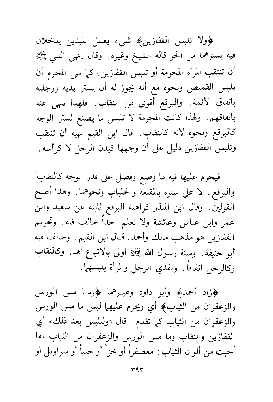 (ولا تلبس القفازين) شيء يعمل لليدين يدخلان فيه يسترهما من الحر قاله الشيخ وغيره. وقال "نهى النبي - صلى الله عليه وسلم - أن تنتقب المرأة المحرمة أو تلبس القفازين" كما نهى المحرم أن يلبيس القميص ونحوه مع أنه يجوز له أن يستر يديه ورجليه باتفاق الأئمة. والبرقع أقوى من النقاب. فلهذا ينهى عنه باتفاقهم. ولهذا كانت المحرمة لا تلبس ما يصنع لستر الوجه كالبرقع ونحوه لأنه كالنقاب. قال ابن القيم نهيه أن تنتقب وتلبس القفازين دليل على أن وجهها كبدن الرجل لا كرأسه.