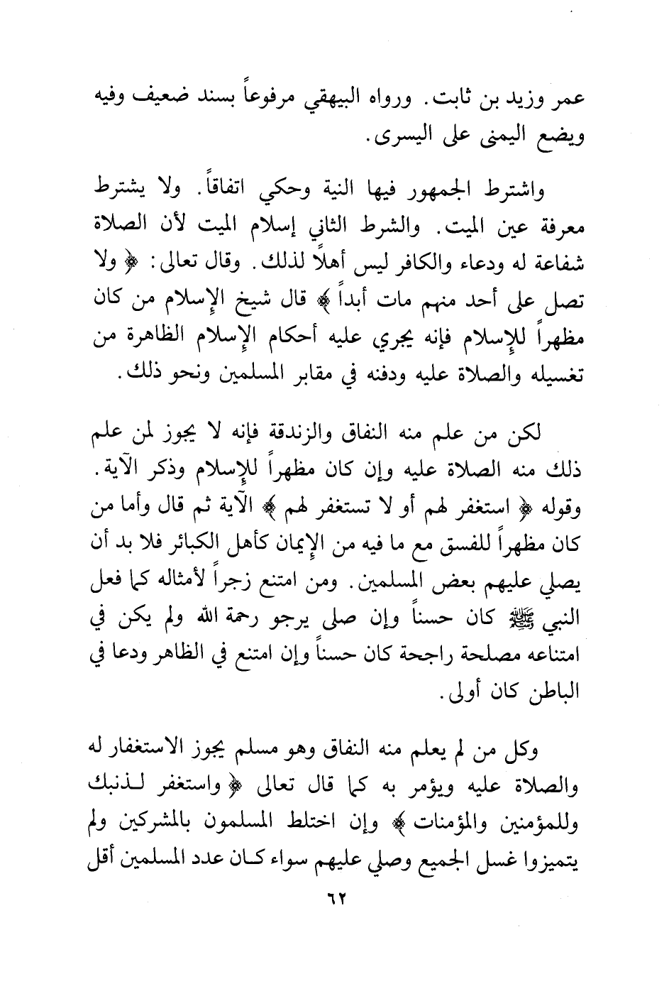 واشترط الجمهور فيها النية وحكي اتفاقا. ولا يشترط معرفة عين الميت. والشرط الثاني إسلام الميت لأن الصلاة شفاعة له ودعاء والكافر ليس أهلاً لذلك. وقال تعالى: {وَلَا تُصَلِّ عَلَى أَحَدٍ مِنْهُمْ مَاتَ أَبَدًا} قال شيخ الإسلام من كان مظهرًا للإسلام فإنه يجري عليه أحكام الإسلام الظاهرة من تغسيله والصلاة عليه ودفنه في مقابر المسلمين ونحو ذلك.