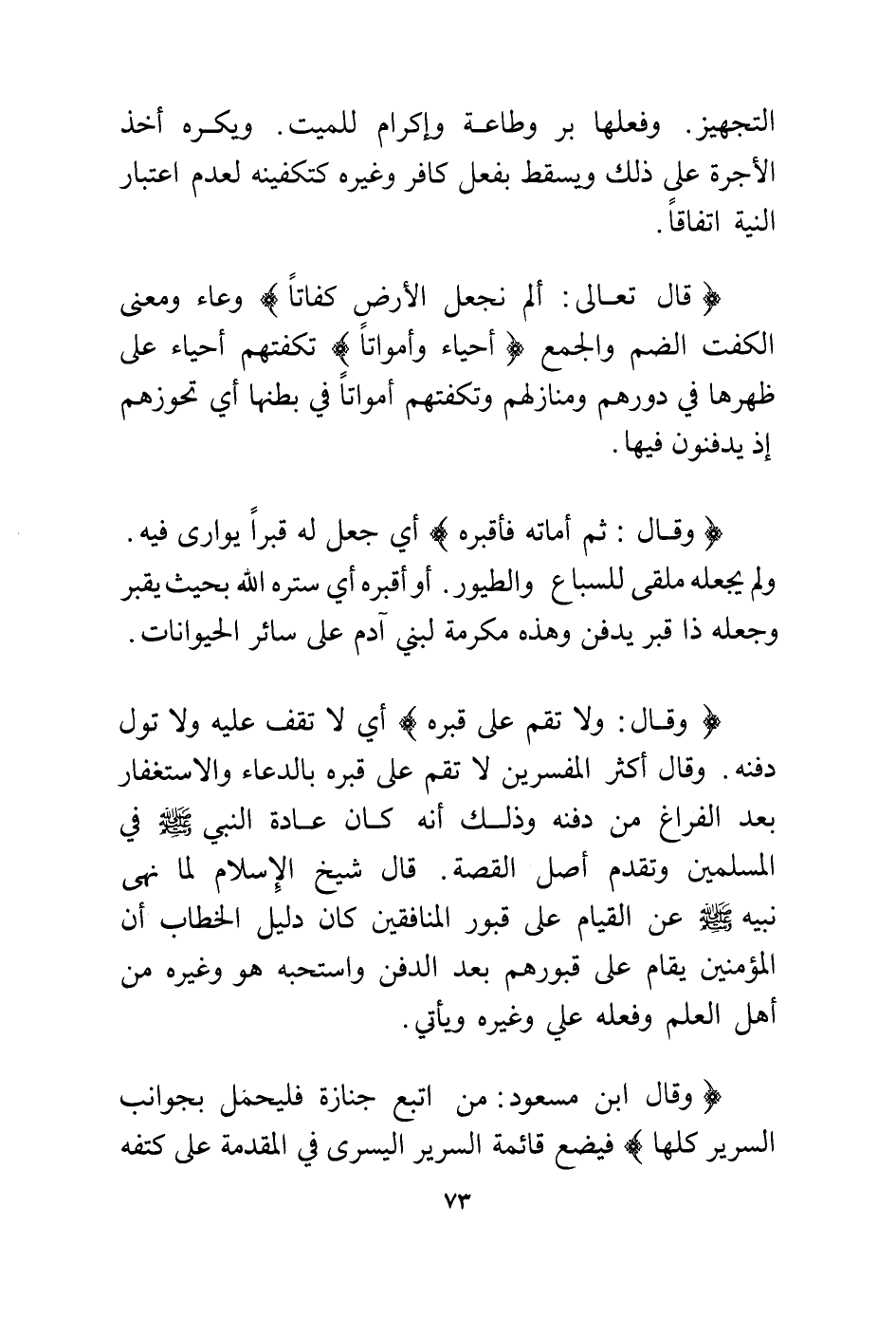 (وقال: وَلَا تَقُمْ عَلَى قَبْرِهِ) أي لا تقف عليه ولا تول دفنه. وقال أكثر المفسرين لا تقم على قبره بالدعاء والاستغفار بعد الفراغ من دفنه وذلك أنه كان عادة النبي - صلى الله عليه وسلم - في المسلمين وتقدم أصل القصة. قال شيخ الإسلام لما نهى نبيه - صلى الله عليه وسلم - عن القيام على قبور المنافقين كان دليل الخطاب أن المؤمنين يقام على قبورهم بعد الدفن واستحبه هو وغيره من أهل العلم وفعله علي وغيره ويأتي.
