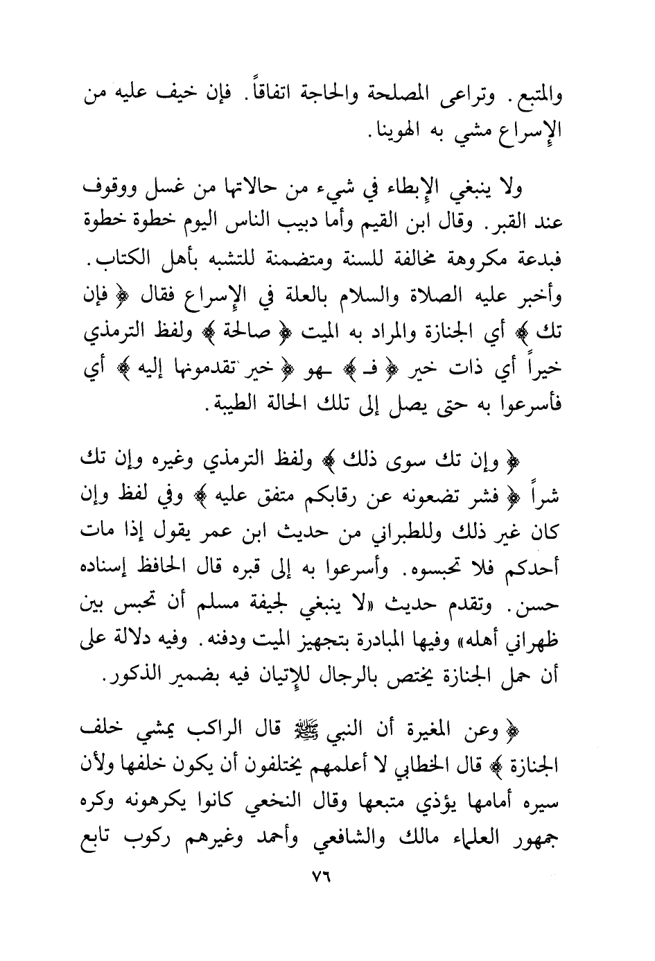 ولا ينبغي الإبطاء في شيء من حالاتها من غسل ووقوف عند القبر. وقال ابن القيم وأما دبيب الناس اليوم خطوة خطوة فبدعة مكروهة مخالفة للسنة ومتضمنة للتشبه بأهل الكتاب. وأخبر عليه والسلام بالعلة في الإسراع فقال (فَإِنْ تَكُ) أي الجنازة والمراد به الميت (صالحة) ولفظ الترمذي خيرًا أي ذات خير (ف) ـهو (خير تقدمونها إليه) أي فأسرعوا به حتى يصل إلى تلك الحالة الطيبة.