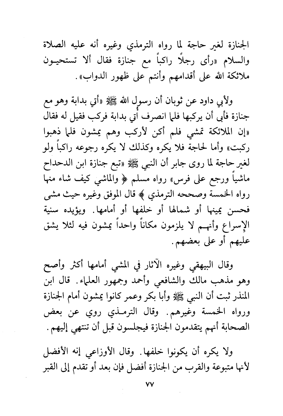 وقال البيهقي وغيره الآثار في المشي أمامها أكثر وأصح وهو مذهب مالك والشافعي وأحمد وجمهور العلماء. قال ابن المنذر ثبت أن النبي - صلى الله عليه وسلم - وأبا بكر وعمر كانوا يمشون أمام الجنازة ورواه الخمسة وغيرهم. وقال الترمذي روي عن بعض الصحابة أنهم يتقدمون الجنازة فيجلسون قبل أن تنتهي إليهم.
