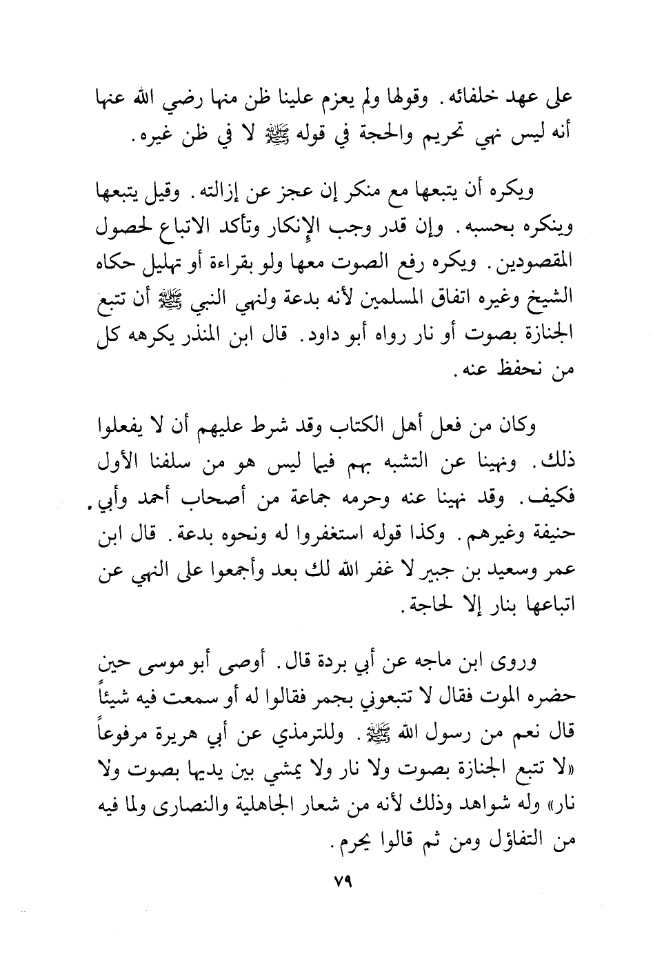 وكان من فعل أهل الكتاب وقد شرط عليهم أن لا يفعلوا ذلك. ونهينا عن التشبه بهم فيما ليس هو من سلفنا الأول فكيف. وقد نهينا عنه وحرمه جماعة من أصحاب أحمد وأبي حنيفة وغيرهم وكذا قوله (استغفروا له) ونحوه بدعة. قال ابن عمر وسعيد بن جبير لا غفر الله لك بعد وأجمعوا على النهي على اتباعها بنار إلا لحاجة.