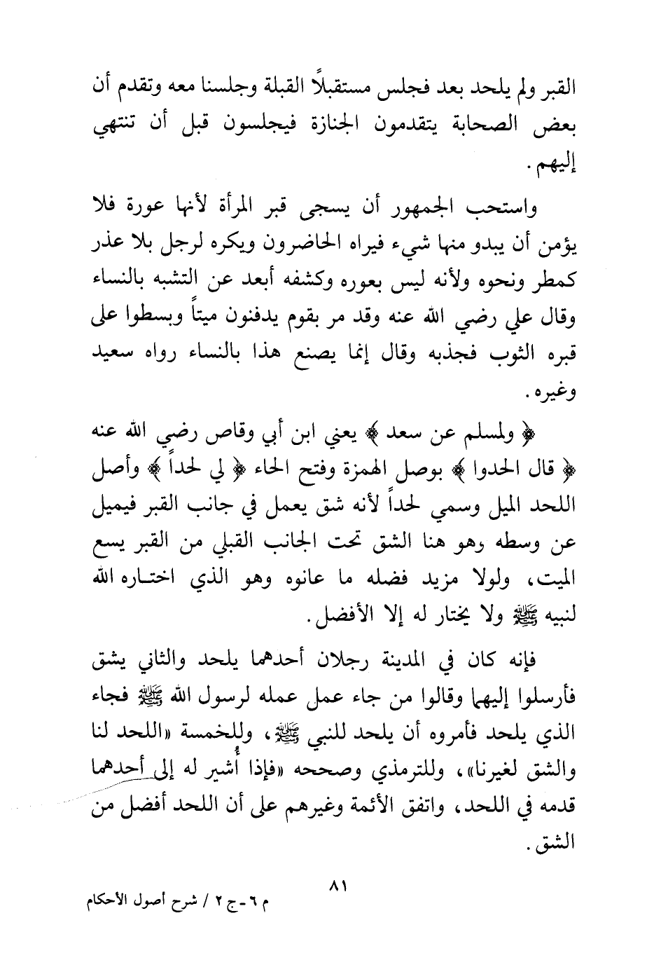 (ولمسلم عن سعد) يعني ابن أبي وقاص رضي الله عنه (قال الحدوا) بوصل الهمزة وفتح الحاء (لي لحدا) وأصل اللحد الميل وسمي لحدا لأنه شق يعمل في جانب القبر فيميل عن وسطه وهو هنا الشق تحت الجانب القبلي من القبر يسع الميت، ولولا مزيد فضله ما عانوه وهو الذي اختاره الله لنبيه - صلى الله عليه وسلم - ولا يختار له إلا الأفضل.