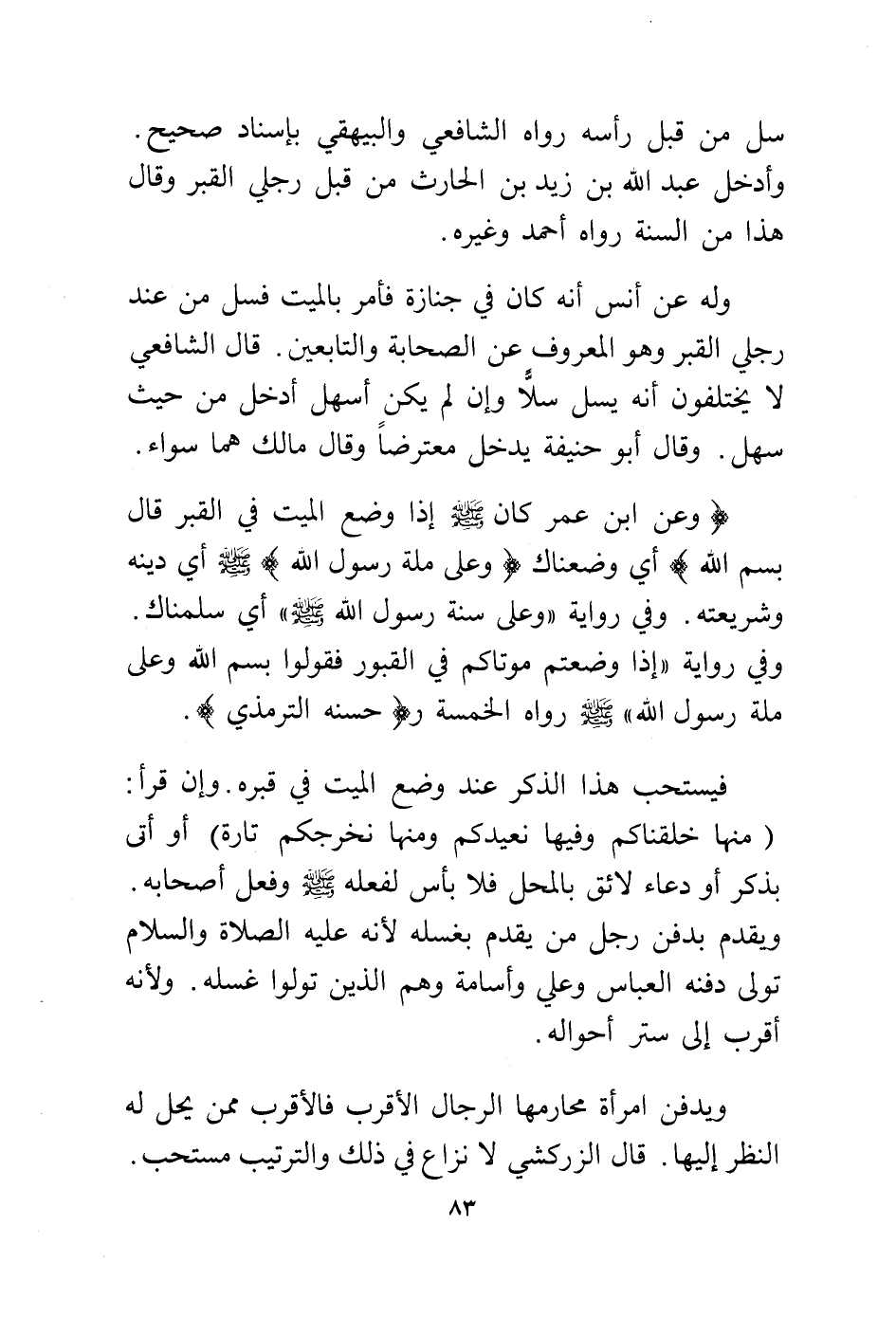 (وعن ابن عمر كان - صلى الله عليه وسلم - إذا وضع الميت في القبر قال بسم الله) أي وضعناك (وعلى ملة رسول الله) - صلى الله عليه وسلم - أي دينه وشريعته. وفي رواية "وعلى سنة رسول الله - صلى الله عليه وسلم - " أي سلمناك: وفي رواية "إذا وضعتم موتاكم في القبور فقولوا بسم الله وعلى ملة رسول الله" - صلى الله عليه وسلم - رواه الخمسة و"حسنه الترمذي".