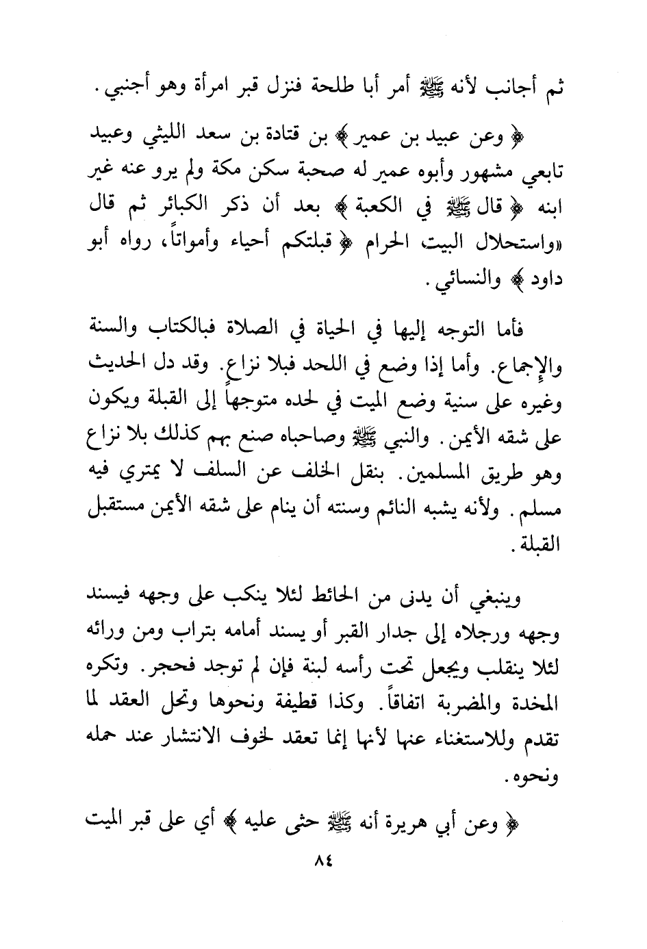 فأما التوجه إليها في الحياة في الصلاة فبالكتاب والسنة والإجماع. وأما إذا وضع في اللحد فبلا نزاع. وقد دل الحديث وغيره على سنية وضع الميت في لحده متوجها إلى القبلة ويكون على شقه الأيمن. والنبي - صلى الله عليه وسلم - وصاحباه صُنِعَ بهم كذلك بلا نزاع وهو طريق المسلمين. بنقل الخلف عن السلف لا يمتري فيه مسلم. ولأنه يشبه النائم وسنته أن ينام على شقه الأيمن مستقبل القبلة.