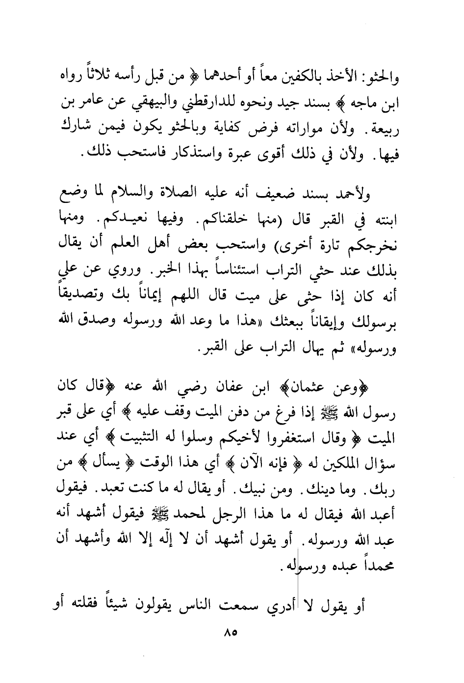 (وعن عثمان) بن عفان رضي الله عنه (قال كان رسول الله - صلى الله عليه وسلم - إذا فرغ من دفن الميت وقف عليه) أي على قبر الميت (وقال استغفروا لأخيكم سلوا له التثبيت) أي عند سؤال الملكين له (فإنه الآن) أي هذا الوقت (يسأل) من ربك؟ وما دينك؟ ومن نبيك؟ أو يقال له ما كنت تبعد. فيقول: أعبد الله فيقال له ما هذا الرجل لمحمد - صلى الله عليه وسلم - فيقول أشهد أنه عبد الله ورسوله. أو يقول أشهد أن لا إله إلا الله وأشهد أن محمدا عبده ورسوله.