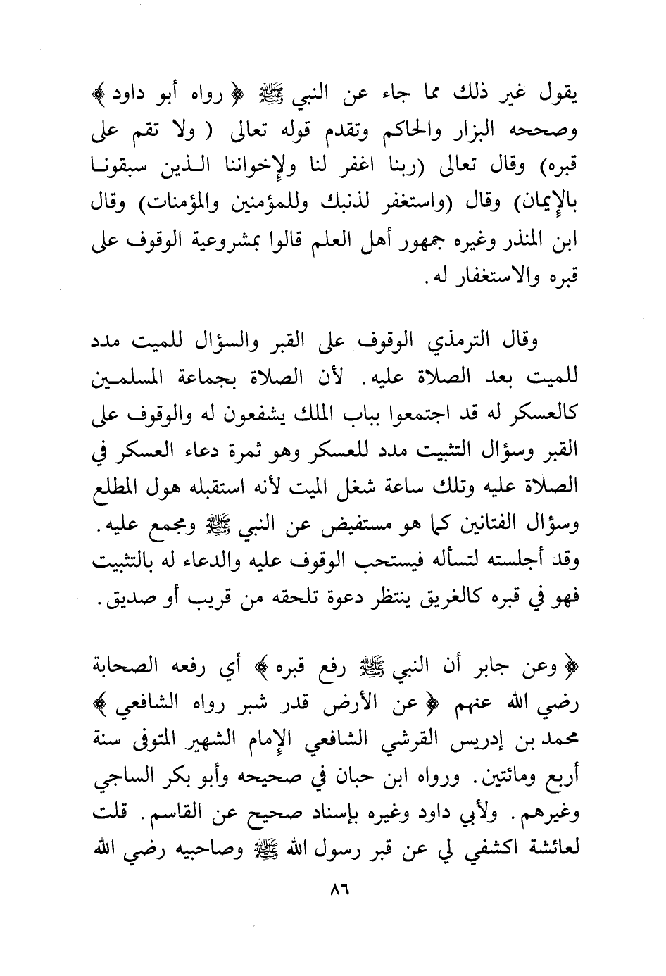 وقال الترمذي الوقوف على القبر والسؤال للميت مدد للميت بعد الصلاة عليه. لأن الصلاة بجماعة المسلمين كالعسكر له قد اجتمعوا بباب الملك يشفعون له والوقوف على القبر وسؤال التثبيت مدد للعسكر وهو ثمرة دعاء العسكر في الصلاة عليه وتلك ساعة شغل الميت لأنه استقبله هول المطلع وسؤال الفتانين كما هو مستفيض عن النبي - صلى الله عليه وسلم - ومجمع عليه.
