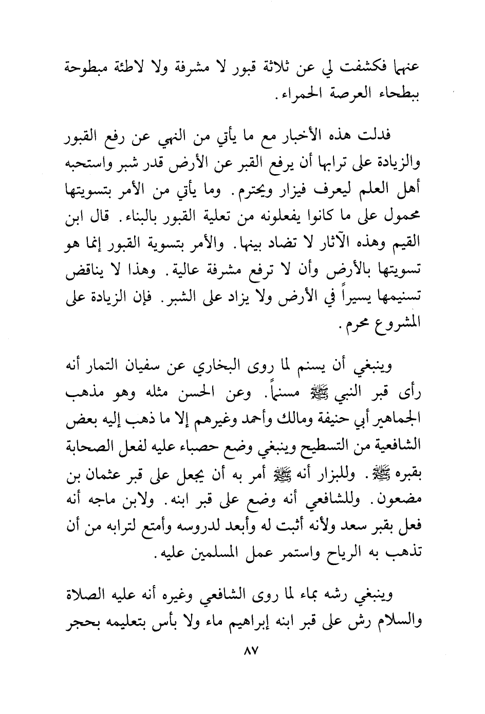 فدلت هذه الأخبار مع ما يأتي من النهي عن رفع القبور والزيادة على ترابها أن يرفع القبر عن الأرض قدر شبر واستحبه أهل العلم ليعرف فيزار ويحترم. وما يأتي من الأمر بتسويتها محمول على ما كانوا يفعلونه من تعلية القبور بالبناء. قال ابن القيم وهذه الآثار لا تضاد بينها. والأمر بتسوية القبور إنما هو تسويتها بالأرض وأن لا ترفع مشرفة عالية. وهذا لا يناقض تسنيمها يسيرا في الأرض ولا يزاد على الشبر. فإن الزيادة على المشروع محرم.