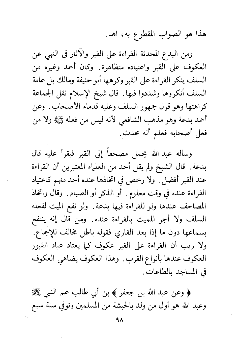 وسأله عبد الله يحمل مصحفا إلى القبر فيقرأ عليه قال: بدعة. قال الشيخ ولم يقل أحد من العلماء المعتبرين أن القراءة عند القبر أفضل. ولا رخص في اتخاذها عنده أحد منهم كاعتياد القراءة عنده في وقت معلوم. أو الذكر أو الصيام. وقال: واتخاذ المصاحف عندها ولو للقراءة فيها بدعة. ولو نفع الميت لفعله السلف ولا أجر للميت بالقراءة عنده. ومن قال إنه ينتفع بسماعها دون ما إذا بعد القارئ فقوله باطل مخالف للإجماع. ولا ريب أن القراءة على القبر عكوف كما يعتاد عباد القبور العكوف عندها بأنواع القرب. وهذا العكوف يضاهي العكوف في المساجد بالطاعات.