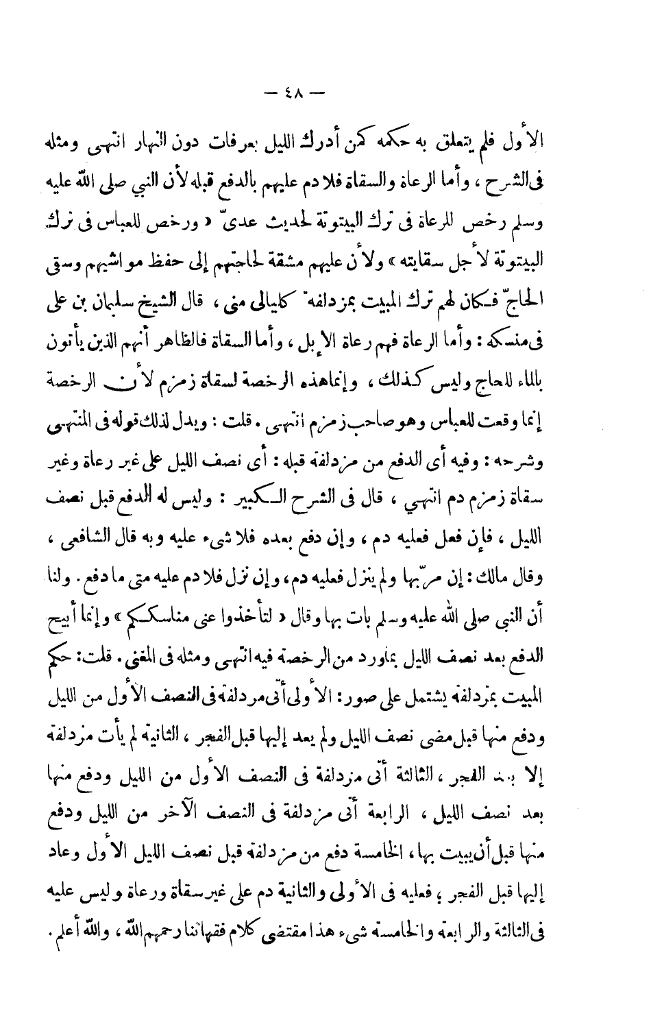 الأول فلم يتعلق به حكمه كمن أدرك الليل بعرفات دون النهار انتهى ومثله في الشرح، وأما الرعاة والسقاة فلا دم عليهم بالدفع قبله لأن النبي صلى الله عليه وسلم رخص للرعاة والسقاة فلا دم عليهم بالدفع قبله لأن النبي صلى الله عليه وسلم رخص للرعاة في ترك البيتوتة لحديث عدي (ورخص للعباس في ترك البيتوتة لأجل سقايته) ولأن عليهم مشقة لحاجتهم إلى حفظ مواشيهم وسقي الحاج فكان لهم ترك المبيت بمزدلفة كليالي منى، قال الشيخ سليمان بن علي في منسكه: وأما الرعاة فهم رعاة الإبل، وأما السقاة فالظاهر إنهم الذين يأتون بالماء للحاج وليس كذلك، وإنما هذه الرخصة لسقاة زمزم لأن الرخصة إنا وقعت للعباس وهو صاحب زمزم انتهى.