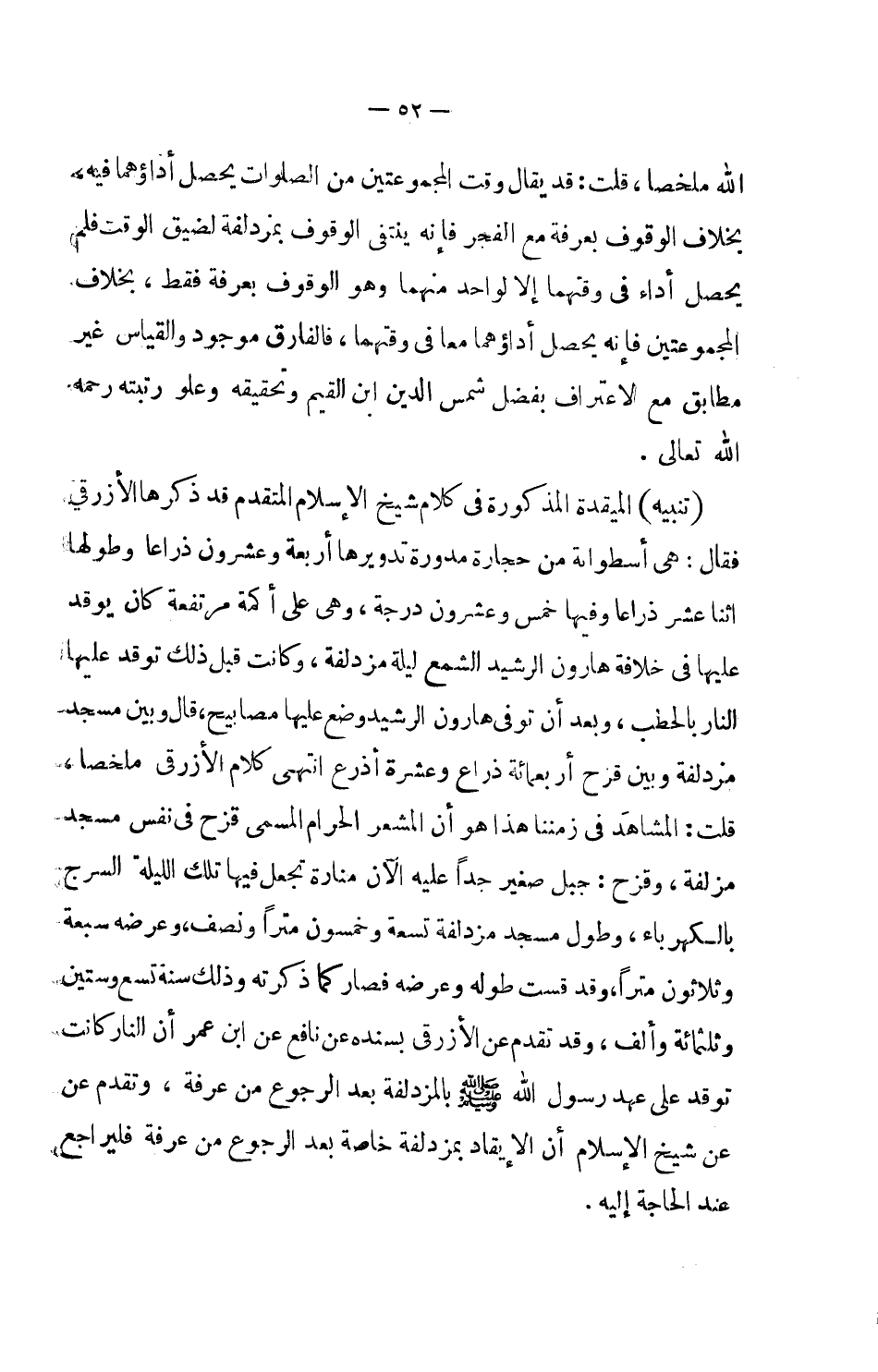 (تنبيه) : الميقدة المذكورة في كلام شيخ الإسلام المتقدم قد ذكرها الأزرقي فقال: هي إسطوانة من حجارة مدورة تدويرها أربعة وعشرون ذراعاً وطولها اثنا عشر ذراعاً وفيها خمس وعشرون درجة، وهي على أكمة مرتفعة كان يوقد عليها في خلافة هارون الرشيد الشمع ليلة مزدلفة، وكانت قبل ذلك توقد عليها النار بالحطب، وبعد أن توفي هارون الرشيد وضع عليها مصابيح، قال وبين مسجد مزدلفة وبين قزح أربعمائة ذراع وعشرة أذرع انتهى كلام الأزرقي ملخصاً، قلت: المشاهد في زمننا هذا هو أن المشعر الحرام المسمى قزح في نفس مسجد مزدلفة، وقزح: جبل صغير جداً عليه الآن منارة تجعل فيها تلك الليلة السرج بالكهرباء، وطول مسجد مزدلفة تسعة وخمسون متراً ونصف، وعرضه سبعة وثلاثون متراً، وقد قسمت طوله وعرضه فصار كما ذكرته وذلك سنة تسع وستين وثلاثمائة وألف، وقد تقدم عن الأزرقي بسنده عن نافع عن ابن عمر أن النار كانت توقد على عهد رسول الله صلى الله عليه وسلم بالمزدلفة بعد الرجوع من عرفة، وتقدم عن شيخ الإسلام أن الإيقاد بمزدلفة خاصة بعد الرجوع من عرفة فليراجع عند الحاجة إليه.