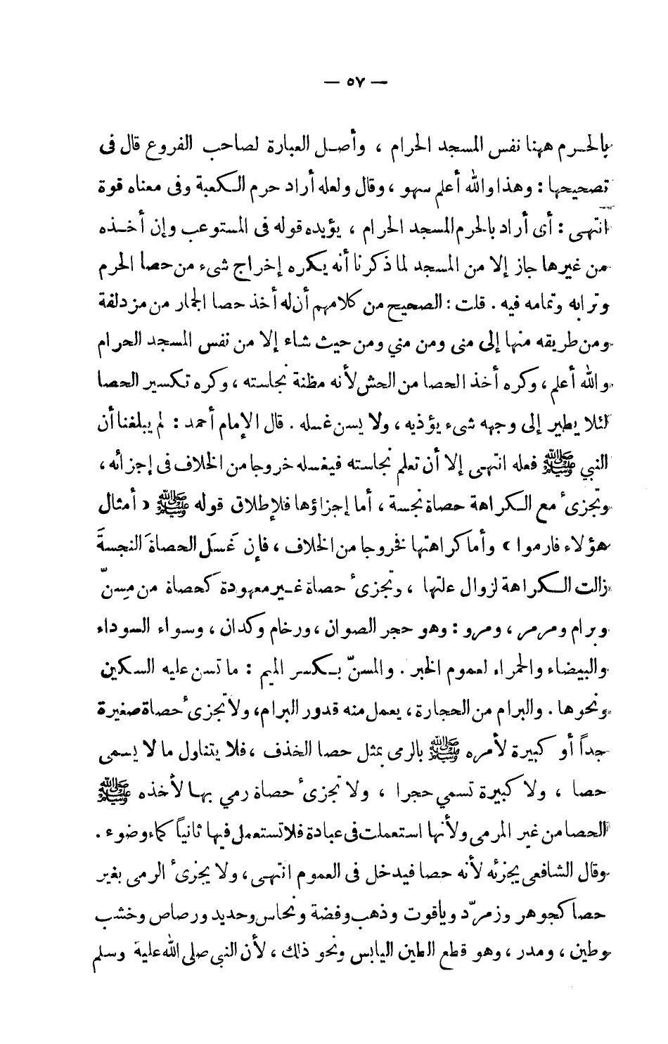 بالحرم هاهنا نفس المسجد الحرام، وأصل العبارة لصاحب الفروع قال في تصحيحها: وهذا والله أعلم سهو، وقال ولعله أراد حرم الكعبة وفي معناه قوة انتهى: أي أراد بالحرم المسجد الحرام، يؤيده قوله في المستوعب وإن أخذه من غيرها جاز إلا من المسجد لما ذكرنا أنه يكره إخراج شيء من حصا الحرم وترابه وتمامه فيه. قلت: الصحيح من كلامهم أن له أخذ حصا الجمار من مزدلفة ومن طريقة منها إلى منى ومن منى ومن حيث شاء إلا من نفس المسجد الحرام والله أعلم، وكره أخذ الحصا من الحش لأنه مظنة نجاسته، وكره تكسير الحصا لئلا يطير إلى وجهه شيء يؤذيه، ولا يسن غسله. قال الإمام أحمد: لم يبلغنا أن النبي صلى الله عليه وسلم فعله انتهى. إلا أن تعلم نجاسته فيغسله خروجاً من الخلاف في أجزائه، وتجزئ مع الكراهة حصاة نجسة، أما أجزاؤها فلإطلاق قوله صلى الله عليه وسلم (أمثال هؤلاء فارموا) وأما كراهتها فخروجاً من الخلاف، فإن غسل الحصاة النجسة زالت الكراهة لزوالها علتها، وتجزئ حصاة غير معهودة كحصاة من مسن وبرام ومرمر، ومرو: وهو حجر الصوان، ورخام وكدان، وسواء السوداء والبيضاء والحمراء لعموم الخبر.