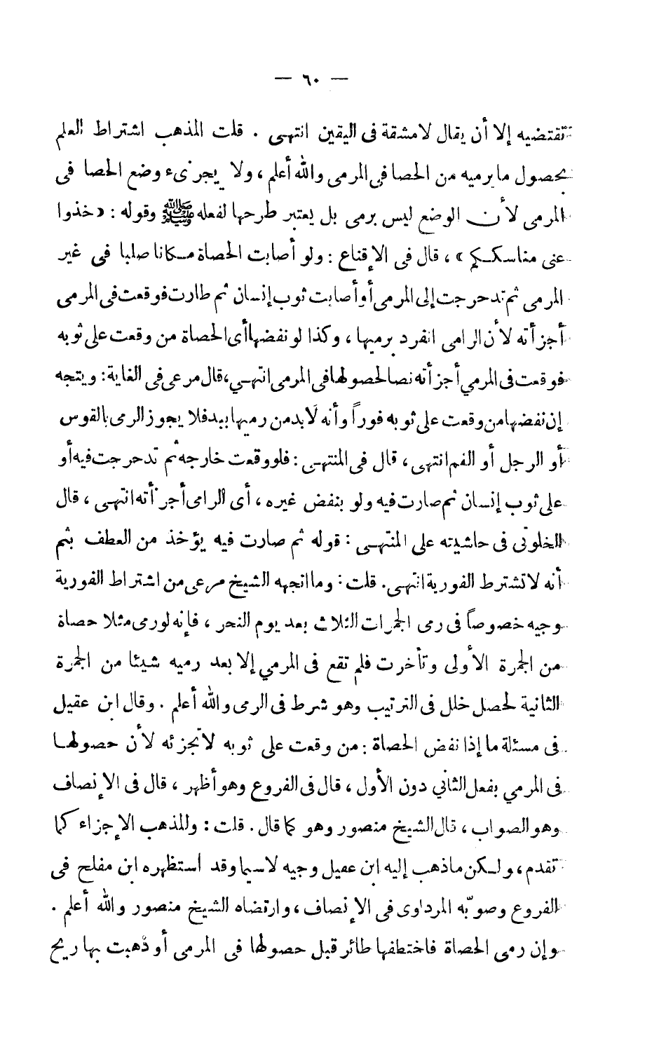 قلت المذهب اشتراط العلم بحصول ما يرميه من الحصا في المرمى والله أعلم. ولا يجزئ وضع الحصا في المرمى لأن الوضع ليس برمي بل يعتبر طرحها لفعله صلى الله عليه وسلم وقوله: (خذوا عني مناسككم) ، قال في الإقناع: ولو أصابت الحصاة مكاناً صلباً في غير المرمى ثم تدحرجت إلى المرمى أو أصابت ثوب إنسان ثم طارت فوقعت في المرمى أجزأته لأن الرامي انفرد برميها، وكذا لو نفضها أي الحصاة من وقعت على ثوبه فوقعت في المرمى أجزأته نصاً لحصولها في المرمى انتهى.