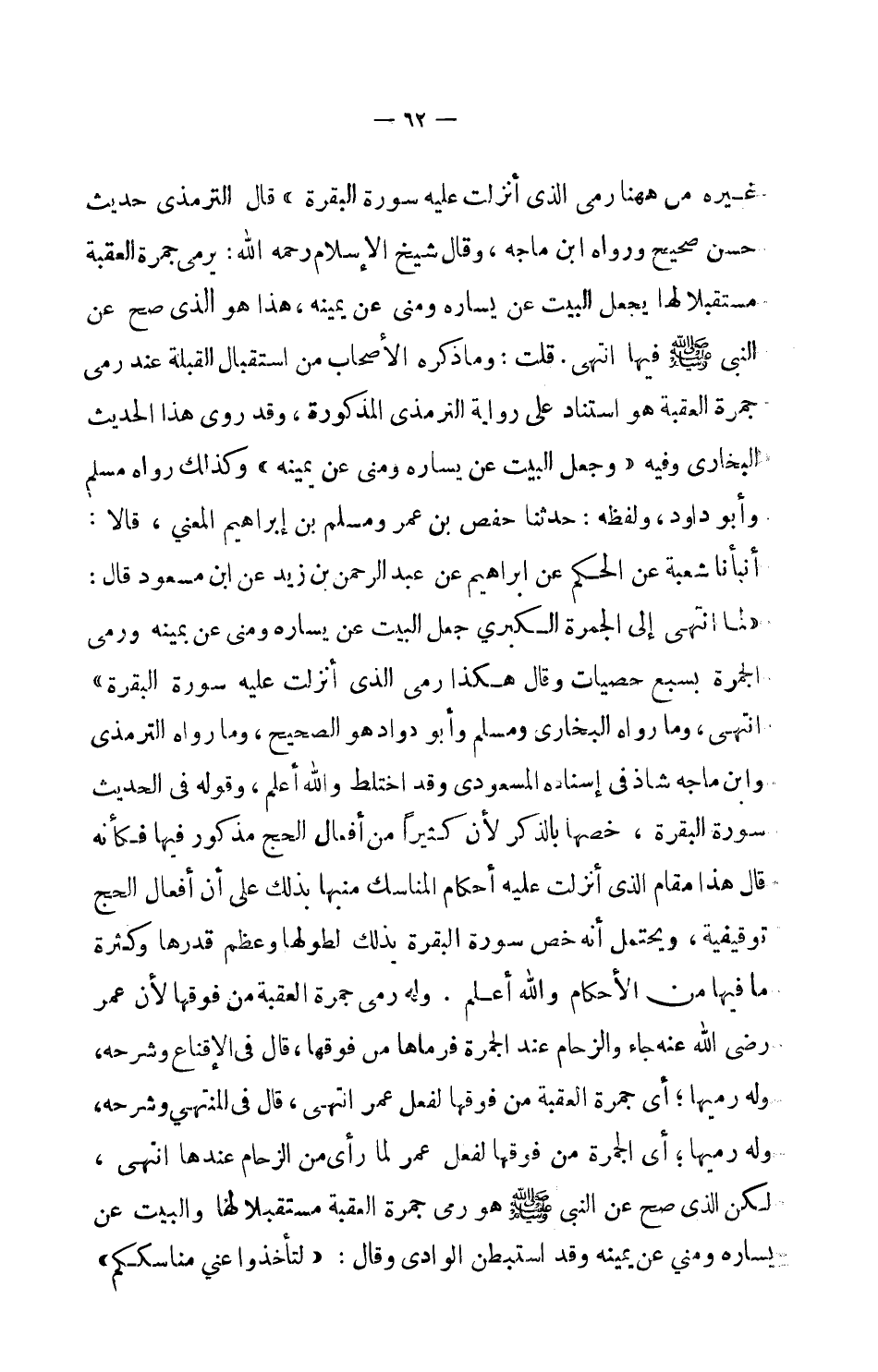 غيره من هاهنا رمى الذي أنزلت عليه سورة البقرة) . قال الترمذي حديث حسن صحيح ورواه ابن ماجة، وقال شيخ الإسلام رحمه الله: يرمي جمرة العقبة مستقبلا لها يجعل البيت عن يساره ومنى عن يمينه، هذا هو الذي صح عن النبي صلى الله عليه وسلم فيها انتهى. قلت: وما ذكره الأصحاب من استقبال القبلة عند رمي جمرة العقبة هو استناد على رواية الترمذي المذكورة، وقد روى هذا الحديث البخاري وفيه: (وجعل البيت عن يساره ومنى عن يمينه) وكذلك رواه مسلم وأبو داود، ولفظه: حدثنا حفص بن عمر ومسلم بن إبراهيم المعني، قالا: أنبأنا شعبة عن الحكم عن إبراهيم عن عبد الرحمن بن زيد عن ابن مسعود قال: (لما انتهى إلى الجمرة الكبرى جعل البيت عن يساره ومنى عن يمينه ورمى الجمرة بسبع حصيات وقال هكذا رمى الذي أنزلت عليه سورة البقرة) انتهى، وما رواه البخاري ومسلم وأبو داود هو الصحيح، وما رواه الترمذي وابن ماجة شاذ في إسناده المسعودي وقد اختلط والله أعلم، وقوله في الحديث سورة البقرة، خصها بالذكر لأن كثيراً من أفعال الحج مذكور فيها فكأنه قال هذا مقام الذي أنزلت عليه أحكام المناسك منبها بذلك على أن أفعال الحج توقيفية، ويحتمل أنه خص سورة البقرة بذلك لطولها وعظم قدرها وكثرة ما فيها من الأحكام والله أعلم.