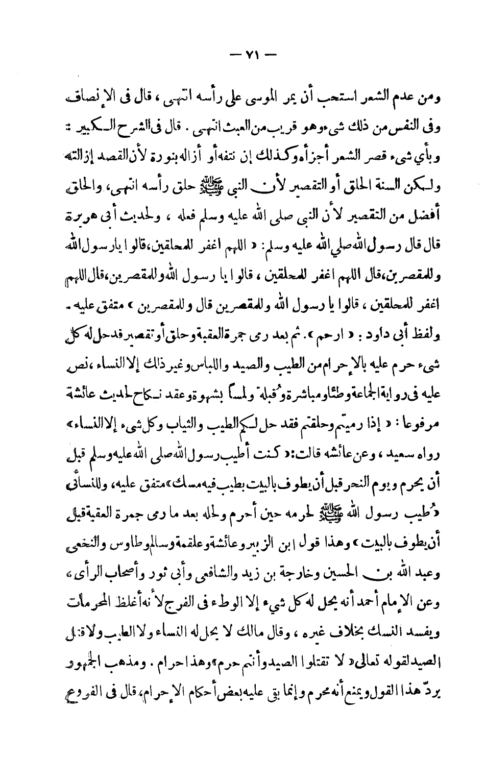 قال في الشرح الكبير: وبأي شيء قصر الشعر أجزأه وكذلك إن نتفه أو أزاله بنورة لأن القصد إزالته ولكن السنة الحلق أو التقصير لأن النبي صلى الله عليه وسلم حلق رأسه انتهى. والحلق أفضل من التقصير لأن النبي صلى الله عليه وسلم فعله، ولحديث أبي هريرة قال، قال رسول الله صلى الله عليه وسلم: (اللهم اغفر للمحلقين، قالوا يا رسول الله وللمقصرين، قال اللهم اغفر للمحلفين، قالوا يا رسول الله وللمقصرين، قال اللهم اغفر للمحلقين، قالوا يا رسول الله وللمقصرين قال وللمقصرين) متفق عليه. ولفظ أبي داود: (ارحم) . ثم بعد رمي جمرة العقبة وحلق أو تقصير قد حل له كل شيء حرم عليه بالإحرام من الطيب والصيد واللباس وغير ذلك إلا النساء، نص عليه في رواية الجماعة وطئاً ومباشرة وقبلة ولمساً بشهوة وعقد نكاح لحديث عائشة مرفوعاً: (إذا رميتم وحلقتم فقد حل لكم الطيب والثياب وكل شيء إلا النساء) رواه سعيد، وعن عائشة قالت: (كنت أطيب رسول الله صلى الله عليه وسلم قبل أن يحرم ويوم النحر قبل أن يطوف بالبيت بطيب فيه مسك) متفق عليه. وللنسائي (طُيَّب رسول الله صلى الله عليه وسلم لحرمه حين أحرم ولحله بعد ما رمى جمرة العقبة قبل أن يطوف بالبيت) وهذا قول ابن الزبير وعائشة وعلقمة وسالم وطاووس والنخعي وعبد الله بن الحسين وخارجة بن زيد والشافعي وأبي ثور وأصحاب الرأي، وعن الإمام أحمد أنه يحل له كل شيء إلا الوطء في الفرج لأنه أغلظ المحرمات ويفسد النسك بخلاف غيره، وقال مالك لا يحل له النساء ولا الطيب ولا قتل الصيد لقوله تعالى: (لا تقتلوا الصيد وأنتم حرم) وهذا حرام. ومذهب الجمهور يرد هذا القول ويمنع أنه محرم وإنما بقي عليه بعض أحكام الإحرام، قال في الفروع