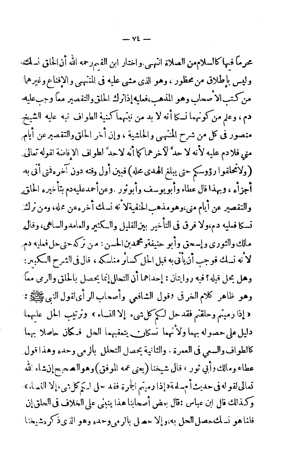 محرماً فيها كالسلام من الصلاة انتهى. واختار ابن القيم رحمه الله أن الحلق نسك وليس بإطلاق من محظور، وهو الذي مشى عليه في المنتهى والإقناع وغيرهما من كتب الأصحاب وهو المذهب، فعليه إذا ترك الحلق والتقصير معاً وجب عليه دم، وعلم من كونهما نسكاً أنه لا بد من نيتهما كنية الطواف نبه عليه الشيخ منصور في كل من شرح المنتهى والحاشية، وإن أخر الحلق والتقصير عن أيام منى فلا دم عليه لأنه لا حدَّ لآخرهما كما أنه لا حدَّ لطواف الإفاضة لقوله تعالى: (ولا تحلقوا رءوسكم حتى تبلغ الهدي محله) فبين أول وقته دون آخره فمتى أتى به أجزأه، وبهذا قال عطاء وأبو يوسف وأبو ثور.