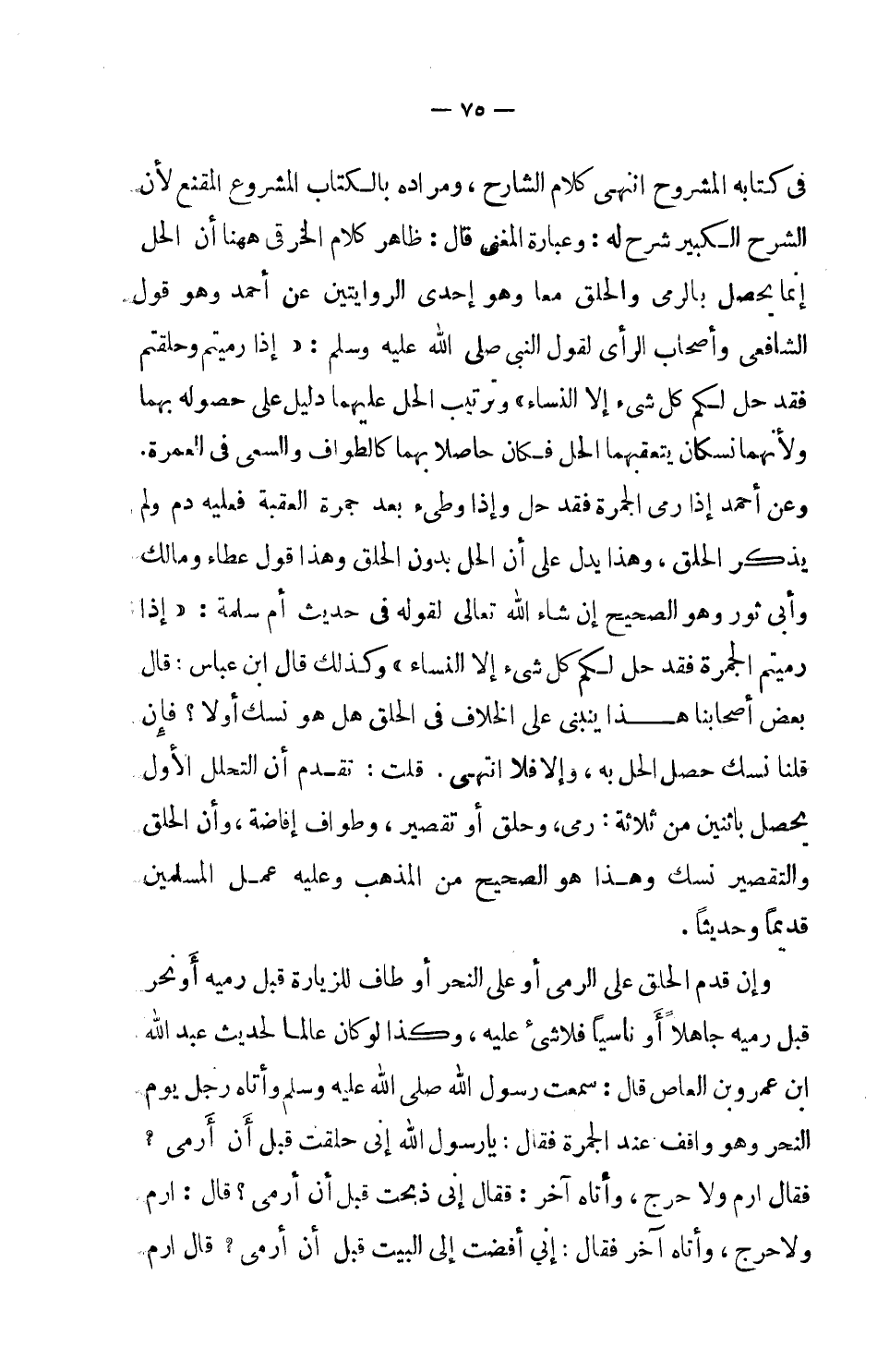في كتابه المشروح انتهى كلام الشارح، ومراده بالكتاب المشروح المقنع لأن الشرح الكبير شرح له: وعبارة المغني قال: ظاهر كلام الخرقي هاهنا أن الحل إنما يحصل بالرمي والحلق معاً وهو إحدى الروايتين عن أحمد وهو قول الشافعي وأصحاب الرأي لقول النبي صلى الله عليه وسلم: (إذا رميتم وحلقتم فقد حل لكم كل شيء إلا النساء) وترتيب الحل عليهما دليل على حصوله بهما ولأنهما نسكان يتعقبهما الحل فكان حاصلاً بهما كالطواف والسعي في العمرة.