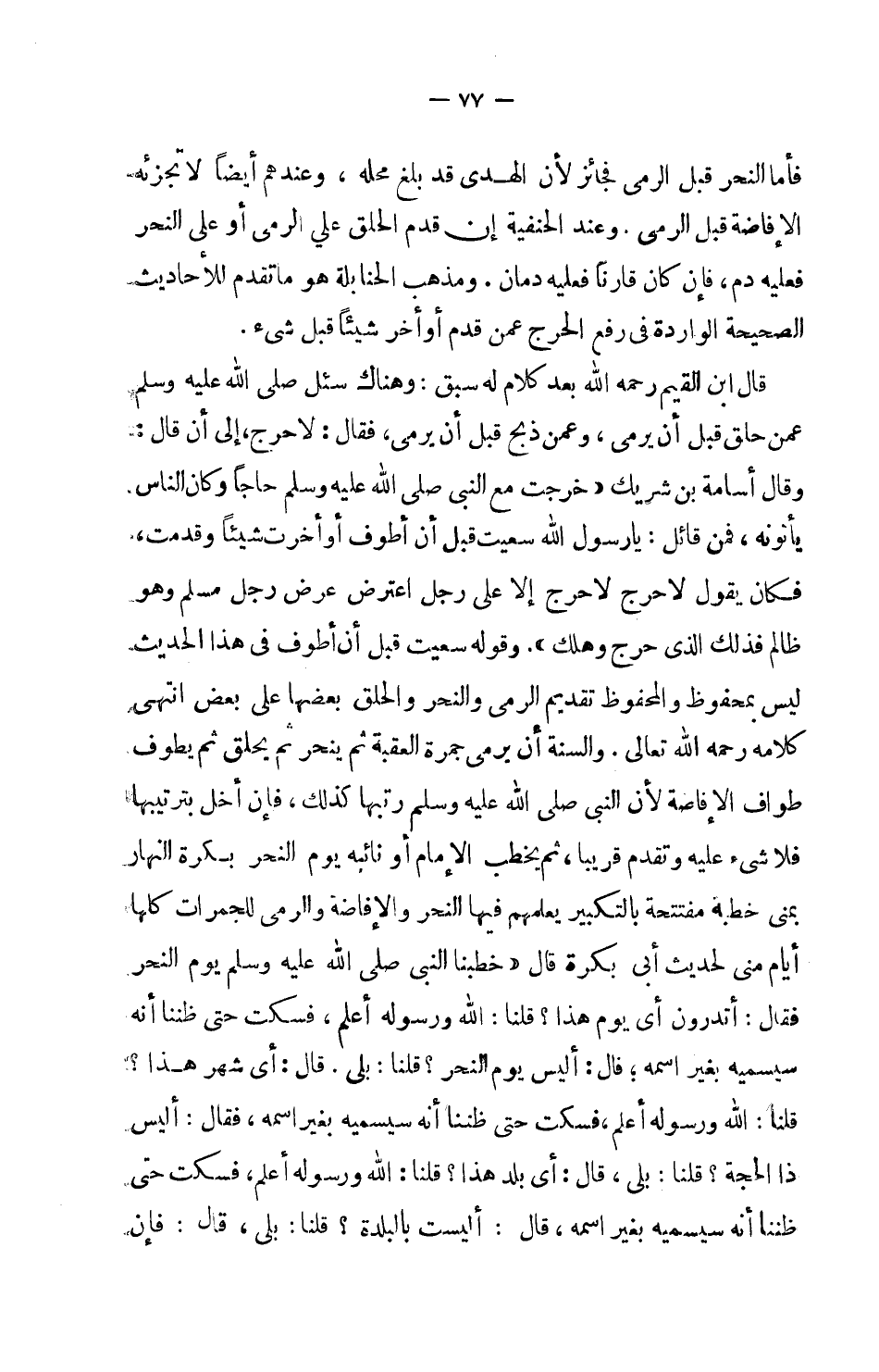 قال ابن القيم رحمه الله بعد كلام له سبق: وهناك سئل صلى الله عليه وسلم عمن حلق قبل أن يرمي، وعمن ذبح قبل أن يرمي، فقال: لا حرج إلى أن قال: وقال أسامة بن شريك (خرجت مع النبي صلى الله عليه وسلم حاجاً وكان الناس يأتونه، فمن قائل: يا رسول الله سعيت قبل أن أطوف أو أخرت شيئاً وقدمت، فكان يقول لا حرج لا حرج إلا على رجل اعترض عرض رجل مسلم وهو ظالم فذلك الذي حرج وهلك) . وقوله سعيت قبل أن أطوف في هذا الحديث ليس بمحفوظ والمحفوظ تقديم الرمي والنحر والحلق بعضها على بعض انتهى كلامه رحمه الله تعالى. والسنة أن يرمي جمرة العقبة ثم ينحر ثم يحلق ثم يطوف طواف الإفاضة لأن النبي صلى الله عليه وسلم رتبها كذلك، فإن أخل بترتيبها فلا شيء عليه وتقدم قريباً، ثم يخطب الإمام أو نائبه يوم النحر بكرة النهار بمنى خطبة مفتتحة بالتكبير يعلمهم فيها النحر والإفاضة والرمي للجمرات كلها أيام منى لحديث أبي بكرة قال (خطبنا النبي صلى الله عليه وسلم يوم النحر فقال: أتدرون أي يوم هذا؟ قلنا: الله ورسوله أعلم، فسكت حتى ظننا أنه سيسميه بغير اسمه، قال: أليس يوم النحر؟ قلنا: بلى. قال: أي شهر هذا؟ قلنا: الله ورسوله أعلم، فسكت حتى ظننا أنه سيسميه بغير اسمه، فقال: أليس ذا الحجة؟ قلنا: بلى، قال: أي بلد هذا؟ قلنا: الله ورسوله أعلم، فسكت حتى ظننا أنه سيسميه بغير اسمه. قال: أليست بالبلدة؟ قلنا: بلى، قال: فإن