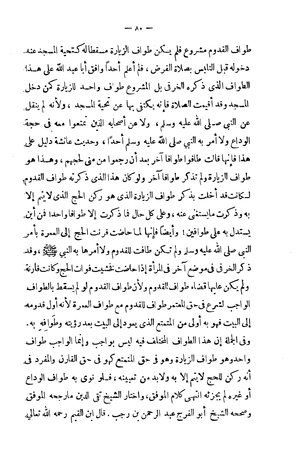 طواف القدوم مشروع فلم يكن طواف الزيارة مسقطاً له كتحية المسجد عند دخوله قبل التلبس بصلاة الفرض، ولم أعلم أحد وافق أبا عبد الله على هذا الطواف الذي ذكره الخرقي بل المشروع طواف واحد للزيارة كمن دخل المسجد وقد أقيمت الصلاة فإنه يكتفي بها عن تحية المسجد، ولأنه لم ينقل عن النبي صلى الله عليه وسلم، ولا عن أصحابة الذين تمتعوا معه في حجة الوداع ولا أمر به النبي صلى الله عليه وسلم أحداً، وحديث عائشة دليل على هذا فإنها قالت طافوا طوافاً آخر بعد أن رجعوا من منى لحجهم، وهذا هو طواف الزيارة ولم تذكر طوافاً آخر ولو كان هذا الذي ذكرته طواف القدوم لكانت قد أخلت بذكر طواف الزيارة الذي هو ركن الحج الذي لا يتم إلا به وذكرت ما يستغنى عنه، وعلى كل حال فما ذكرت إلا طوافاً واحداً فمن أين يستدل به على طوافين، وأيضاً فإنها لما حاضت قرنت الحج إلى العمر بأمر النبي صلى الله عليه وسلم ولم تكن طافت للقدوم ولا أمرها به النبي صلى الله عليه وسلم، وقد ذكر
