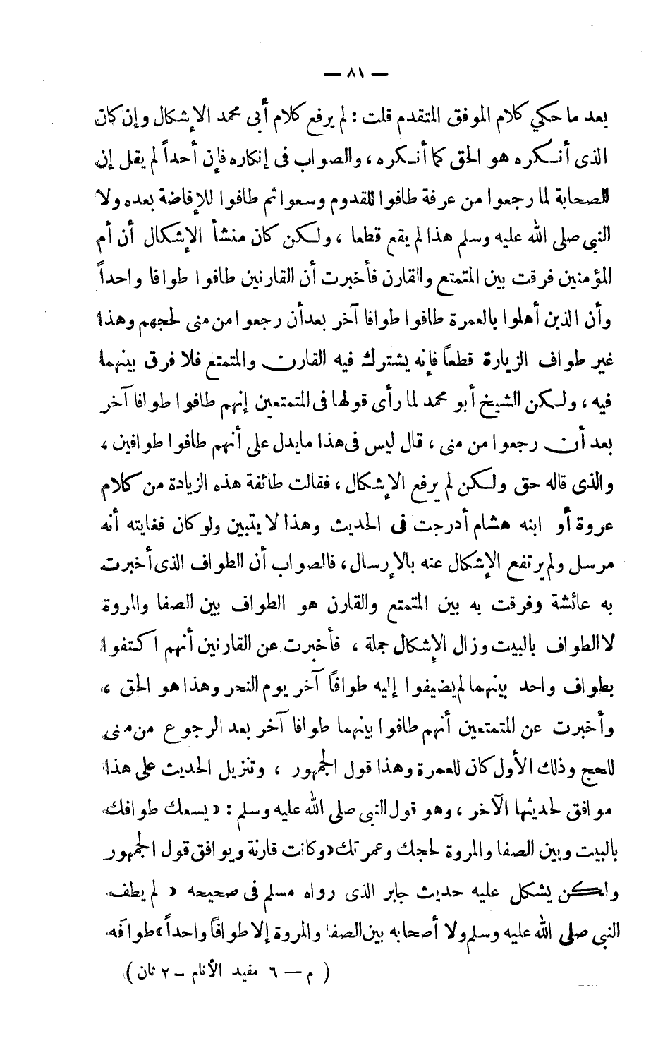 بعدما حكى كلام الموفق المتقدم قلت: لم يرفع كلام أبي محمد الإشكال وإن كان الذي أنكره هو الحق كما أنكره، والصواب في إنكاره، فإن أحداً لم يقل إن الصحابة لما رجعوا من عرفة طافوا للقدوم وسعوا ثم طافوا للإفاضة بعده ولا النبي صلى الله عليه وسلم هذا لم يقطع قطعاً، ولكن كان منشأ الإشكال أن أم المؤمنين فرقت بين المتمتع والقارن فأخبرت أن القارنين طافوا طوافاً واحداً وأن الذين أهلوا بالعمرة طافوا طوافاً آخر بعد أن رجعوا من منى لحجهم وهذا غير طواف الزيارة قطعاً فإنه يشترك فيه القارن والتمتع فلا فرق بينهما فيه، ولكن الشيخ أبو محمد لما رأى قولها في المتمتعين أنهم طافوا طوافاً آخر بعد أن رجعوا من منى، قال لبس في هذا ما يدل على أنهم طافوا طوافين، والذي قاله حق ولكن لم يرفع الإشكال، فقالت طائفة هذه الزيادة من كلام عروة أو ابنه هشام أدرجت في الحديث وهذا لا يتبين ولو كان فغايته أنه مرسل ولم يرتفع الإشكال عنه بالإرسال، فالصواب أن الطواف الذي أخبرت به عائشة وفرقت به بين المتمتع والقارن هو الطواف بين الصفا والمروة لا الطواف بالبيت وزال الإشكال جملة، فأخبرت عن القارنين أنهم اكتفوا بطواف واحد بينهما لم يضيفوا إليه طوافاً آخر يوم النحر وهذا هو الحق، وأخبرت عن المتمتعين أنهم طافوا بينهما طوافاً آخر بعد الرجوع من منى للحج وذلك الأول كان للعمرة وهذا قول الجمهور، وتنزيل الحديث على هذا موافق لحديثها الآخر، وهو قول النبي صلى الله عليه وسلم: (يسعك طوافك بالبيت وبين الصفا والمروة لحجك وعمرتك) وكانت قارنة ويوافق قول الجمهور، ولكن يشكل عليه حديث جابر الذي رواه مسلم في صحيحه (لم يطف النبي صلى الله عليه وسلم ولا أصحابه بين الصفا والمروة إلا طوافاً واحداً) طوافه