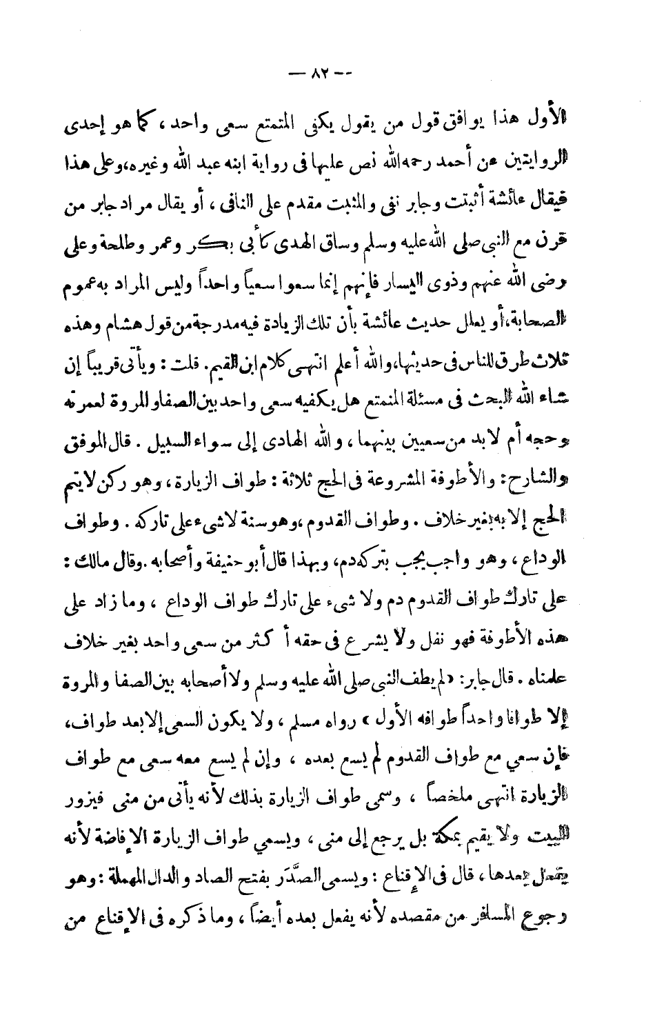وغيره، وعلى هذا فيقال عائشة أثبتت وجابر نفى والمثبت مقدم على النافي، أو يقال مراد جابر من قرن مع النبي صلى الله عليه وسلم وساق الهدي كأبي بكر وعمر وطلحة وعلي رضي الله عنهم وذوي اليسار فإنهم إنما سعوا سعياً واحداً وليس المراد به عموم الصحابة، أو يعلل حديث عائشة بأن تلك الزيادة فيه مدرجة من قول هشام وهذه ثلاث طرق للناس في حديثها، والله أعلم انتهى كلام ابن القيم. قلت: ويأتي قريباً إن شاء الله البحث في مسألة المتمتع هل يكفيه سعي واحد بين الصفا والمروة لعمرته وحجه أم لا بد من سعيين بينهما، والله الهادي إلى سواء السبيل.