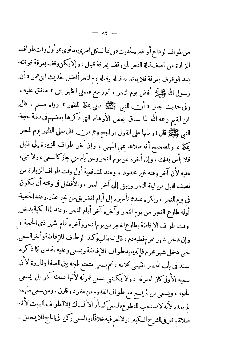 من طواف الوداع أو غيره لحديث (وإنما لكل امرئ ما نوى) وأول وقت طواف الزيارة من نصف ليلة النحر لمن وقف بعرفة قبل، وإلا يكن وقف بعرفة فوقته بعد الوقوف بعرفة فلا يعتد به قبله وفعله يوم النحر أفضل لحديث ابن عمر (أن رسول الله صلى الله عليه وسلم أفاض يوم النحر، ثم رجع فصلى الظهر بمنى) متفق عليه، وفي حديث جابر (أن النبي صلى الله عليه وسلم صلى بمكة الظهر) . رواه مسلم. قال ابن القيم رحمه الله لما ساق بعض الأوهام التي ذكرها بعضهم في صفة حجة النبي صلى الله عليه وسلم قال: ومنها على القول الراجح وهم من قال صلى الظهر يوم النحر بمكة، والصحيح أنه صلاها بمنى انتهى، وإن أخر طواف الزيارة إلى الليل فلا بأس بذلك، وإن أخره عن يوم النحر وعن أيام منى جاز كالسعي، ولا شيء عليه لأن آخر وتقه غير محدود، وعند الشافعية أول وقت طواف الزيارة من نصف الليل من ليلة النحر ويبقى إلى آخر العمر، والأفضل في وقته أن يكون في يوم النحر، ويكره عندهم تأخيره إلى أيام التشريق من غير عذر، وعند الحنفية أوله طلوع الفجر من يوم النحر وآخره آخر أيام النحر، وعند المالكية يدخل وقت طواف الإفاضة بطلوع الفجر من يوم النحر وآخره تمام شهر ذي الحجة، وإن دخل شهر محرم فعليه دم. قال الحطاب وكذا لو طاف للإفاضة وأخر السعي حتى دخل شهر محرم فنه يعيد طواف الإفاضة ويسعى وعليه الهدي كما ذكره سند في باب المحصر انتهى كلامه، ثم يسعى متمتع لحجه بين الصفا والمروة لأن سعيه الأول كان لعمرته، ولا يكتفى بسعي عمرته لأنها نسك آخر بل يسعى لحجه، ويسعى من لم يسع مع طواف القدوم من مفرد وقارن، ومن سعى منهما لم يعده لأنه لا يستحب التطوع بالسعي كسائر الأنساك إلا الطواف بالبيت لأنه صلاة، قال في الشرح الكبير: ولا نعلم فيه خلافاً، والسعي ركن في الحج فلا يتحلل.