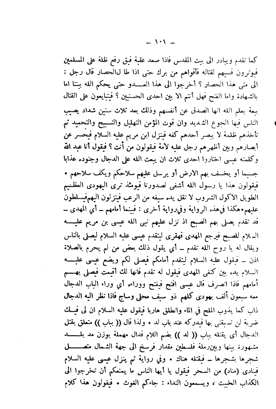 كَمَا تَقَدَّمَ وَيُبَادِرُ إِلَى بَيْتِ الْمَقْدِسِ فَإِذَا صَعِدَ عَقَبَةَ فِيقٍ رَفَعَ ظُلَّةً عَلَى الْمُسْلِمِينَ فَيُوتِرُونَ قِسِيَّهُمْ لِقِتَالِهِ فَأَقْوَاهُمْ مَنْ بَرَكَ حَتَّى إِذَا طَالَ الْحِصَارُ قَالَ رَجُلٌ: إِلَى مَتَى هَذَا الْحِصَارُ؟ اخْرُجُوا إِلَى هَذَا الْعَدُوِّ حَتَّى يَحْكُمَ اللَّهُ بَيْنَنَا إِمَّا بِالشَّهَادَةِ وَإِمَّا الْفَتْحُ فَهَلْ أَنْتُمْ إِلَّا بَيْنَ إِحْدَى الْحُسْنَيَيْنِ؟ فَيَتَبَايَعُونَ عَلَى الْقِتَالِ بَيْعَةً يَعْلَمُ اللَّهُ أَنَّهَا الصِّدْقُ عَنْ أَنْفُسِهِمْ وَذَلِكَ بَعْدَ ثَلَاثِ سِنِينَ شِدَادٍ يُصِيبُ النَّاسَ فِيهَا الْجُوعُ الشَّدِيدُ وَإِنَّ قُوتَ الْمُؤْمِنِ التَّهْلِيلُ وَالتَّسْبِيحُ وَالتَّحْمِيدُ ثُمَّ تَأْخُذُهُمْ ظُلْمَةٌ لَا يُبْصِرُ أَحَدُهُمْ كَفَّهُ فَيَنْزِلُ ابْنُ مَرْيَمَ عَلَيْهِ السَّلَامُ فَيَحْسُرُ عَنْ أَبْصَارِهِمْ وَبَيْنَ أَظْهُرِهِمْ رَجُلٌ عَلَيْهِ لَأْمَةٌ فَيَقُولُونَ مَنْ أَنْتَ؟ فَيَقُولُ أَنَا عَبْدُ اللَّهِ وَكَلِمَتُهُ عِيسَى اخْتَارُوا إِحْدَى ثَلَاثٍ: أَنْ يَبْعَثَ اللَّهُ عَلَى الدَّجَّالِ وَجُنُودِهِ عَذَابًا جَسِيمًا أَوْ يَخْسِفَ بِهِمُ الْأَرْضَ أَوْ يُرْسِلَ عَلَيْهِ سِلَاحَكُمْ وَيَكُفَّ سِلَاحَهُمْ. فَيَقُولُونَ: هَذَا يَا رَسُولَ اللَّهِ أَشَفَى لِصُدُورِنَا فَيَوْمَئِذٍ تَرَى الْيَهُودِيَّ الْعَظِيمَ الطَّوِيلَ الْأَكُولَ الشَّرُوبَ لَا تُقِلُّ يَدُهُ سَيْفَهُ مِنَ الرُّعْبِ فَيَنْزِلُونَ إِلَيْهِمْ فَيُسَلَّطُونَ عَلَيْهِمْ» .