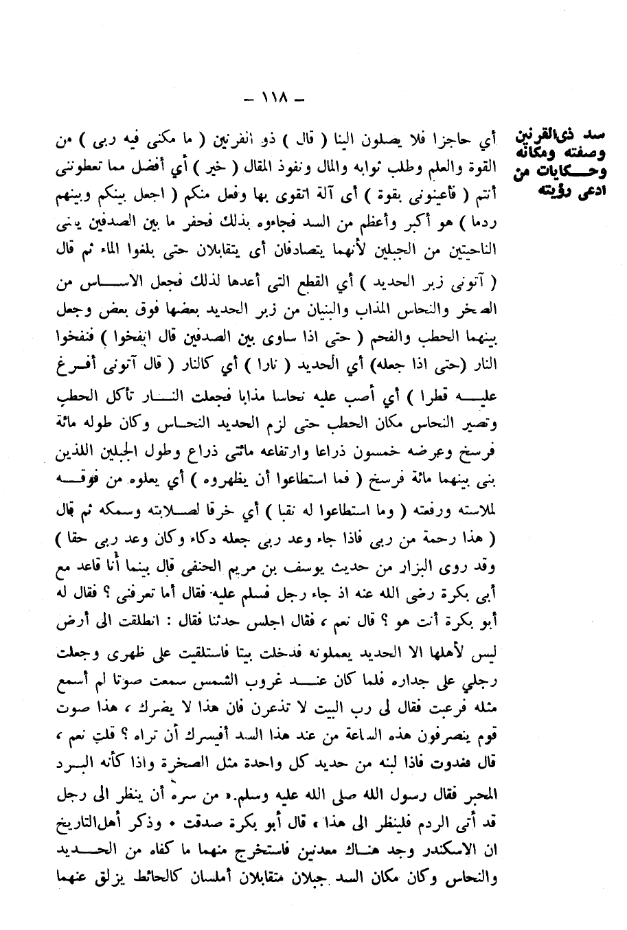 وَقَدْ رَوَى الْبَزَّارُ مِنْ حَدِيثِ يُوسُفَ ابْنِ مَرْيَمَ الْحَنَفِيِّ قَالَ «بَيْنَمَا أَنَا قَاعِدٌ مَعَ أَبِي بَكْرَةَ رَضِيَ اللَّهُ عَنْهُ إِذْ جَاءَ رَجُلٌ فَسَلَّمَ عَلَيْهِ فَقَالَ أَمَا تَعْرِفُنِي؟ فَقَالَ لَهُ أَبُو بَكْرَةَ أَنْتَ هُوَ؟ قَالَ نَعَمْ، فَقَالَ اجْلِسْ حَدِّثْنَا فَقَالَ: انْطَلَقْتُ إِلَى أَرْضٍ لَيْسَ لِأَهْلِهَا إِلَّا الْحَدِيدُ يَعْمَلُونَهُ فَدَخَلْتُ بَيْتًا فَاسْتَلْقَيْتُ عَلَى ظَهْرِي وَجَعَلْتُ رِجْلِي عَلَى جِدَارِهِ فَلَمَّا كَانَ عِنْدَ غُرُوبِ الشَّمْسِ سَمِعْتُ صَوْتًا لَمْ أَسْمَعْ مِثْلَهُ فَرُعِبْتُ فَقَالَ لِي رَبُّ الْبَيْتِ لَا تُذْعَرَنَّ فَإِنَّ هَذَا لَا يَضُرُّكَ، هَذَا صَوْتُ قَوْمٍ يَنْصَرِفُونَ هَذِهِ السَّاعَةَ مِنْ عِنْدِ هَذَا السَّدِّ أَفَيَسُرُّكَ أَنْ تَرَاهُ؟ قُلْتُ نَعَمْ، قَالَ فَغَدَوْتُ فَإِذَا لَبِنُهُ مِنْ حَدِيدٍ كُلُّ وَاحِدَةٍ مِثْلُ الصَّخْرَةِ وَإِذَا كَأَنَّهُ الْبُرْدُ الْمُحَبَّرُ فَقَالَ رَسُولُ اللَّهِ صَلَّى اللَّهُ عَلَيْهِ وَسَلَّمَ " مَنْ سَرَّهُ أَنْ يَنْظُرَ إِلَى رَجُلٍ قَدْ أَتَى الرَّدْمَ فَلْيَنْظُرْ إِلَى هَذَا " قَالَ أَبُو بَكْرَةَ صَدَقْتَ» .
