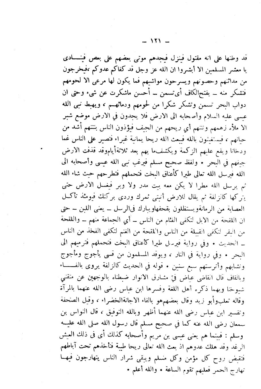 وَلَفْظُ صَحِيحِ مُسْلِمٍ «فَيَرْغَبُ نَبِيُّ اللَّهِ عِيسَى وَأَصْحَابُهُ إِلَى اللَّهِ فَيُرْسِلُ اللَّهُ تَعَالَى طَيْرًا كَأَعْنَاقِ الْبُخْتِ فَتَحْمِلُهُمْ فَتَطْرَحُهُمْ حَيْثُ شَاءَ اللَّهُ ثُمَّ يُرْسِلُ اللَّهُ مَطَرًا لَا يَكُنْ مَعَهُ بَيْتُ مَدَرٍ وَلَا وَبَرٍ فَيَغْسِلُ الْأَرْضَ حَتَّى يَتْرُكَهَا كَالزَّلَقَةِ ثُمَّ يُقَالُ لِلْأَرْضِ أَنْبِتِي ثَمَرَكِ وَرُدِّي بَرَكَتَكِ فَيَوْمَئِذٍ تَأْكُلُ الْعِصَابَةُ مِنَ الرُّمَّانَةِ وَيَسْتَظِلُّونَ بِقِحْفِهَا وَيُبَارَكُ فِي الرِّسْلِ - يَعْنِي اللَّبَنَ - حَتَّى إِنَّ اللِّقْحَةَ مِنَ الْإِبِلِ لَتَكْفِي الْفِئَامَ مِنَ النَّاسِ - أَيِ الْجَمَاعَةَ مِنْهُمْ - وَاللِّقْحَةَ مِنَ الْبَقَرِ لَتَكْفِي الْقَبِيلَةَ مِنَ النَّاسِ وَاللِّقْحَةَ مِنَ الْغَنَمِ لَتَكْفِي الْفَخِذَ مِنَ النَّاسِ» - الْحَدِيثَ.