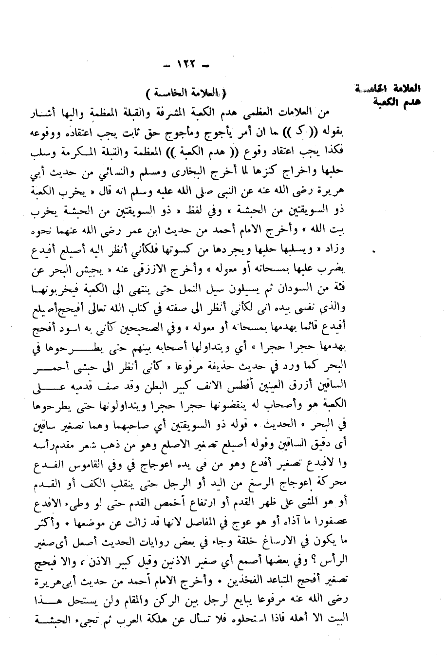 مِنَ الْعَلَامَاتِ الْعُظْمَى: هَدْمُ الْكَعْبَةِ الْمُشَرَّفَةِ وَالْقِبْلَةِ الْمُعَظَّمَةِ وَإِلَيْهَا أَشَارَ بِقَوْلِهِ ((كَ)) مَا أَنَّ أَمْرَ يَأْجُوجَ وَمَأْجُوجَ حَقٌّ ثَابِتٌ يَجِبُ اعْتِقَادُهُ وَوُقُوعُهُ فَكَذَا يَجِبُ اعْتِقَادُ وُقُوعِ ((هَدْمِ الْكَعْبَةِ)) الْمُعَظَّمَةِ وَالْقِبْلَةِ الْمُكَرَّمَةِ، وَسَلْبِ حُلِيِّهَا، وَإِخْرَاجِ كَنْزِهَا لِمَا أَخْرَجَ الْبُخَارِيُّ وَمُسْلِمٌ، وَالنَّسَائِيُّ مِنْ حَدِيثِ أَبِي هُرَيْرَةَ - رَضِيَ اللَّهُ عَنْهُ - عَنِ النَّبِيِّ - صَلَّى اللَّهُ عَلَيْهِ وَسَلَّمَ - أَنَّهُ قَالَ " «يُخَرِّبُ الْكَعْبَةَ ذُو السُّوَيْقَتَيْنِ مِنَ الْحَبَشَةِ» " وَفِي لَفْظٍ " «ذُو السُّوَيْقَتَيْنِ مِنَ الْحَبَشَةِ يُخَرِّبُ بَيْتَ اللَّهِ» ".