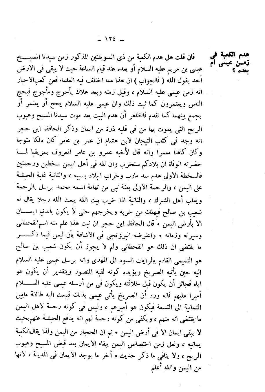 فَإِنْ قُلْتَ: هَلْ هَدْمُ الْكَعْبَةِ مِنْ ذِي السُّوَيْقَتَيْنِ الْمَذْكُورِ زَمَنَ سَيِّدِنَا الْمَسِيحِ عِيسَى ابْنِ مَرْيَمَ عَلَيْهِ السَّلَامُ أَوْ بَعْدَهُ عِنْدَ قِيَامِ السَّاعَةِ حَيْثُ لَا يَبْقَى فِي الْأَرْضِ أَحَدٌ يَقُولُ اللَّهَ؟ (فَالْجَوَابُ) أَنَّ هَذَا مِمَّا اخْتَلَفَ فِيهِ الْعُلَمَاءُ، فَعَنْ كَعْبِ الْأَحْبَارِ أَنَّهُ زَمَنَ عِيسَى عَلَيْهِ السَّلَامُ، وَقِيلَ زَمَنَهُ وَبَعْدَ هَلَاكِ يَأْجُوجَ وَمَأْجُوجَ فَيَحُجُّ النَّاسُ وَيَعْتَمِرُونَ كَمَا ثَبَتَ ذَلِكَ، وَأَنَّ عِيسَى عَلَيْهِ السَّلَامُ يَحُجُّ أَوْ يَعْتَمِرُ، أَوْ يَجْمَعُ بَيْنَهُمَا كَمَا تَقَدَّمَ، فَالظَّاهِرُ أَنَّ هَدْمَ الْبَيْتِ بَعْدَ مَوْتِ سَيِّدِنَا الْمَسِيحِ، وَهُبُوبِ الرِّيحِ الَّتِي يَمُوتُ بِهَا مَنْ فِي قَلْبِهِ ذَرَّةٌ مِنْ إِيمَانٍ، وَذَكَرَ الْحَافِظُ ابْنُ حَجَرٍ أَنَّهُ وَجَدَ فِي كِتَابِ " التِّيجَانِ " لِابْنِ هِشَامٍ أَنَّ عُمَرَ بْنَ عَامِرٍ كَانَ مَلِكًا مُتَوَّجًا وَكَانَ كَاهِنًا مُعَمَّرًا وَأَنَّهُ قَالَ لِأَخِيهِ عَمْرِو بْنِ عَامِرٍ الْمَعْرُوفِ بِمَزِيقِيَا لَمَّا حَضَرَتْهُ الْوَفَاةُ، إِنَّ بِلَادَكُمْ سَتَخْرُبُ وَإِنَّ لِلَّهِ فِي أَهْلِ الْيَمَنِ سُخْطَيْنِ وَرَحْمَتَيْنِ، فَالسُّخْطَةُ الْأُولَى: هَدْمُ سَدِّ مَأْرَبَ وَخَرَابُ الْبِلَادِ بِسَبَبِهِ، وَالثَّانِيَةُ: غَلَبَةُ الْحَبَشَةِ عَلَى الْيَمَنِ.