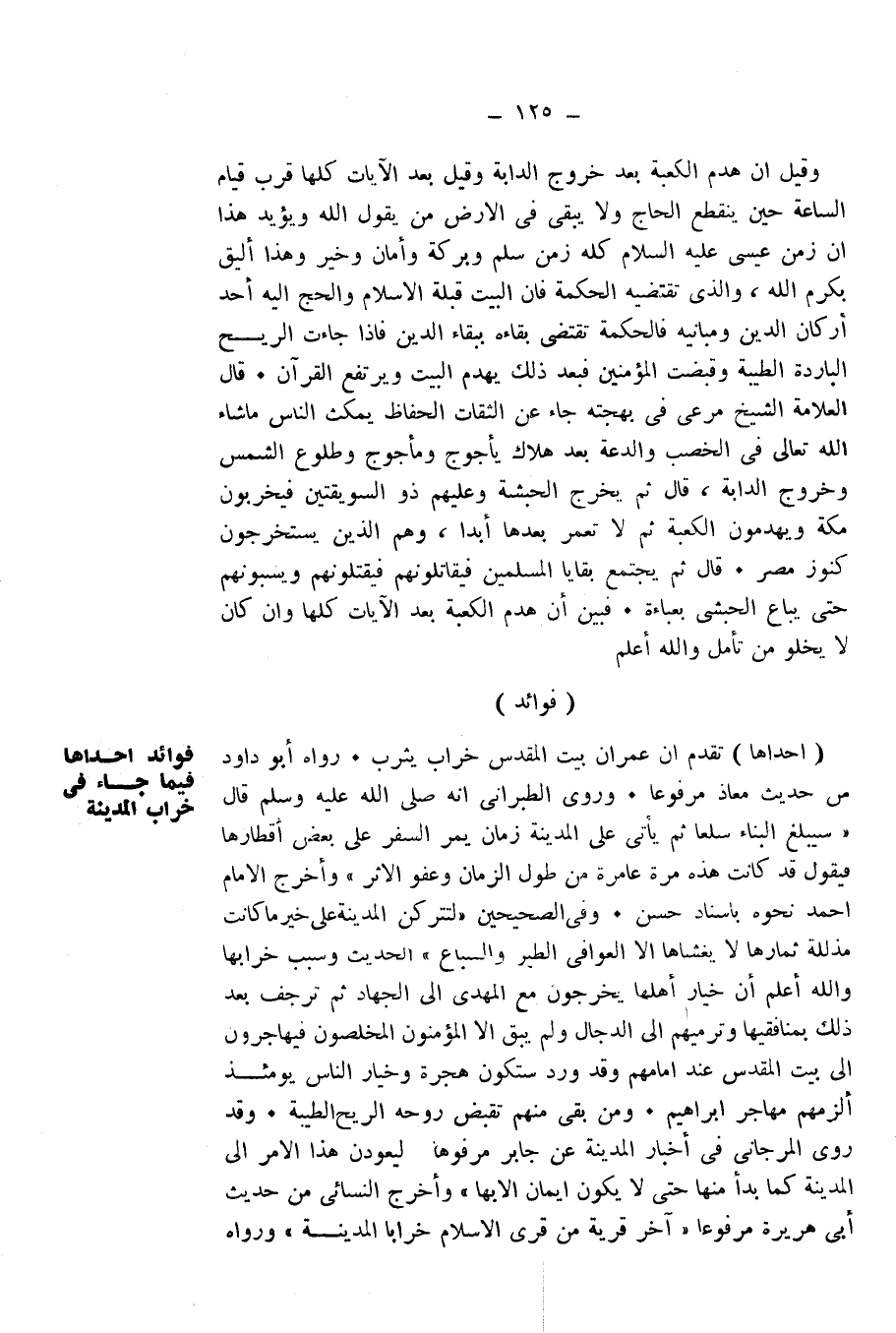 (إِحْدَاهَا) تَقَدَّمَ أَنَّ عُمْرَانَ بَيْتِ الْمَقْدِسِ خَرَابُ يَثْرِبَ. رَوَاهُ أَبُو دَاوُدَ مِنْ حَدِيثِ مُعَاذٍ مَرْفُوعًا.