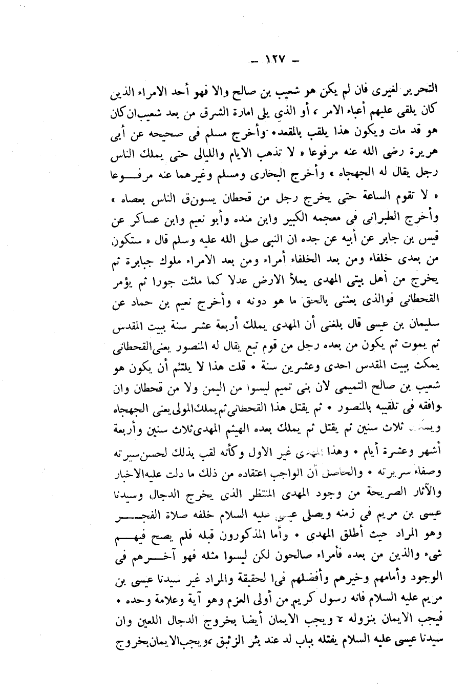 وَأَمَّا الْمَذْكُورُونَ قَبْلَهُ فَلَمْ يَصِحَّ فِيهِمْ شَيْءٌ وَالَّذِينَ مِنْ بَعْدِهِ فَأُمَرَاءُ صَالِحُونَ لَكِنْ لَيْسُوا مِثْلَهُ فَهُوَ آخِرُهُمْ فِي الْوُجُودِ وَإِمَامُهُمْ وَخَيْرُهُمْ وَأَفْضَلُهُمْ فِي الْحَقِيقَةِ وَالْمُرَادُ غَيْرُ سَيِّدِنَا عِيسَى ابْنِ مَرْيَمَ عَلَيْهِ السَّلَامُ فَإِنَّهُ رَسُولٌ كَرِيمٌ مِنْ أُولِي الْعَزْمِ وَهُوَ آيَةٌ وَعَلَامَةٌ وَحْدَهُ. فَيَجِبُ الْإِيمَانُ بِنُزُولِهِ، وَيَجِبُ الْإِيمَانُ أَيْضًا بِخُرُوجِ الدَّجَّالِ اللَّعِينِ، وَأَنَّ سَيِّدَنَا عِيسَى يَقْتُلُهُ بِبَابِ لُدٍّ عِنْدَ بِئْرِ الزِّئْبَقِ، وَيَجِبُ الْإِيمَانُ بِخُرُوجِ