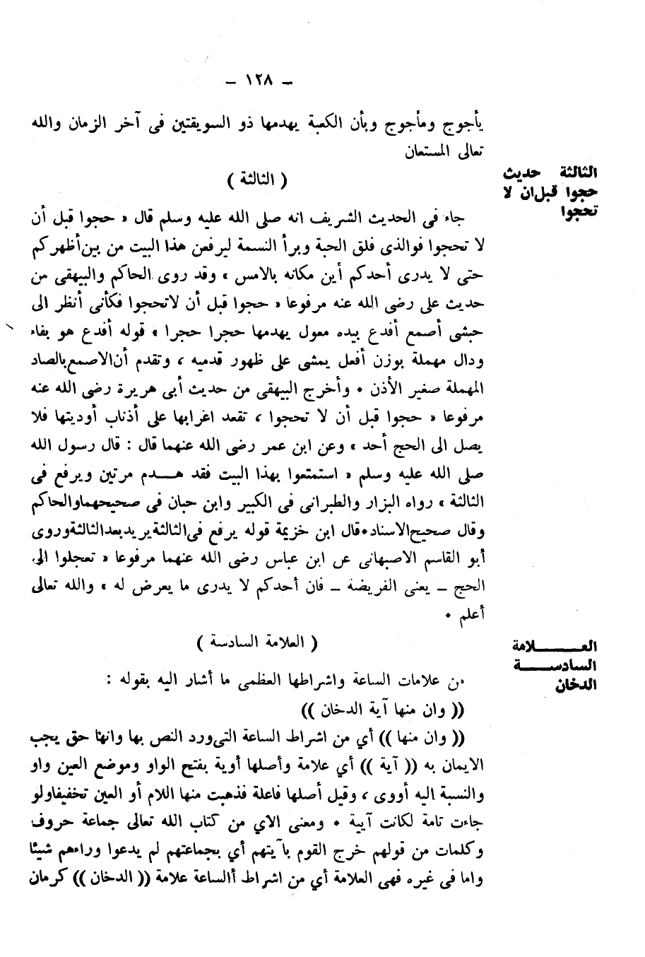 يَأْجُوجَ وَمَأْجُوجَ وَبِأَنَّ الْكَعْبَةَ يَهْدِمُهَا ذُو السُّوَيْقَتَيْنِ فِي آخِرِ الزَّمَانِ وَاللَّهُ تَعَالَى الْمُسْتَعَانُ.
