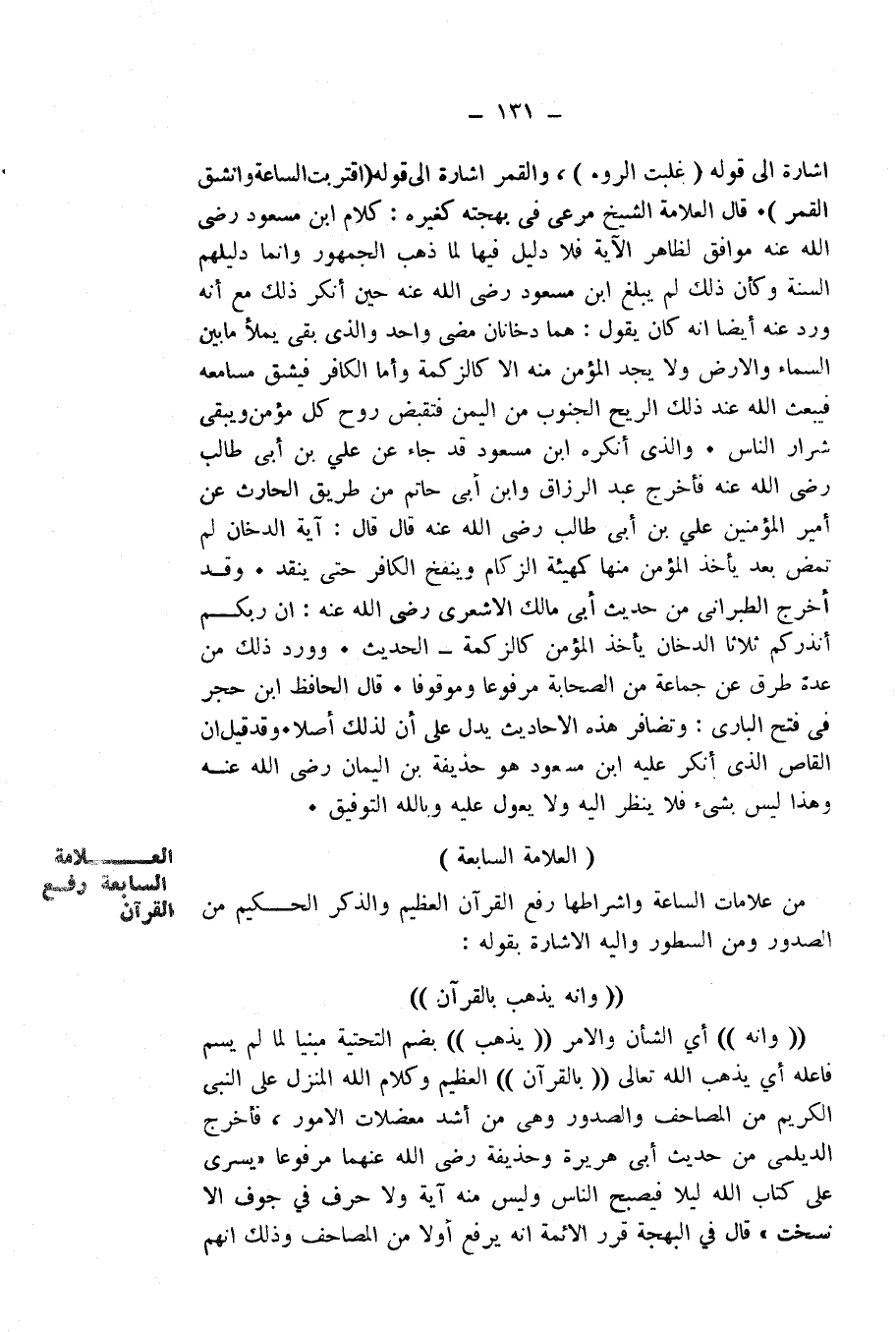 مِنْ عَلَامَاتِ السَّاعَةِ وَأَشْرَاطِهَا رَفْعُ الْقُرْآنِ الْعَظِيمِ وَالذِّكْرِ الْحَكِيمِ مِنَ الصُّدُورِ وَمِنَ السُّطُورِ وَإِلَيْهِ الْإِشَارَةُ بِقَوْلِهِ: ((وَإِنَّهُ يُذْهَبُ بِالْقُرْآنِ)) ((وَإِنَّهُ)) أَيِ الشَّأْنُ وَالْأَمْرُ ((يُذْهَبُ)) بِضَمِّ التَّحْتِيَّةِ مَبْنِيًّا لِمَا لَمْ يُسَمَّ فَاعِلُهُ أَيْ يَذْهَبُ اللَّهُ تَعَالَى ((بِالْقُرْآنِ)) الْعَظِيمِ وَكَلَامِ اللَّهِ الْمُنَزَّلِ عَلَى النَّبِيِّ الْكَرِيمِ مِنَ الْمَصَاحِفِ وَالصُّدُورِ وَهِيَ مِنْ أَشَدِّ مُعْضِلَاتِ الْأُمُورِ، فَأَخْرَجَ الدَّيْلَمِيُّ مِنْ حَدِيثِ أَبِي هُرَيْرَةَ، وَحُذَيْفَةَ رَضِيَ اللَّهُ عَنْهُمَا مَرْفُوعًا " «يُسْرَى عَلَى كِتَابِ اللَّهِ لَيْلًا فَيُصْبِحُ النَّاسُ وَلَيْسَ مِنْهُ آيَةٌ وَلَا حَرْفٌ فِي جَوْفٍ إِلَّا نُسِخَتْ» ".